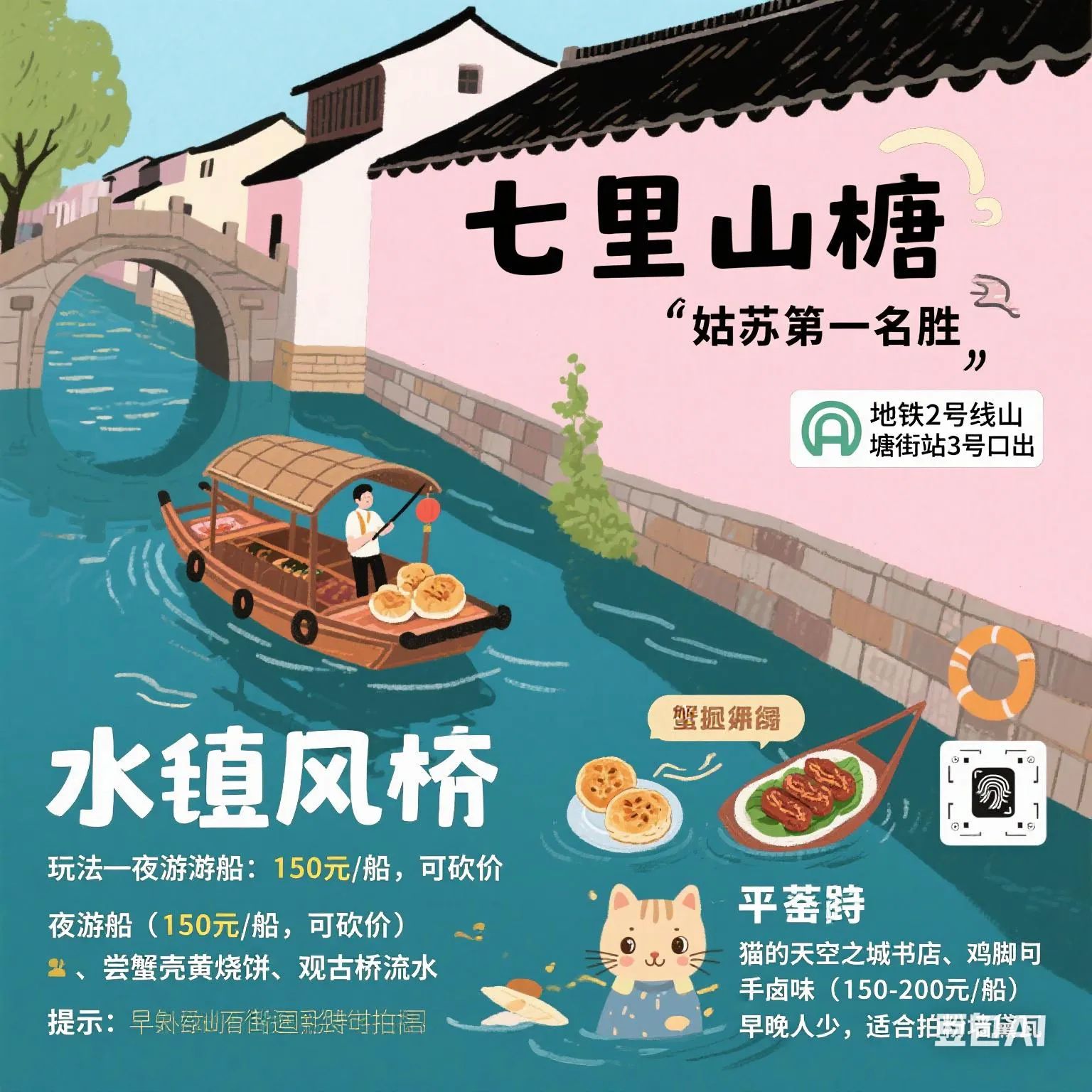 - 玩法:夜游船(150元/船,可砍价)、尝蟹壳黄烧饼、观古桥流水。