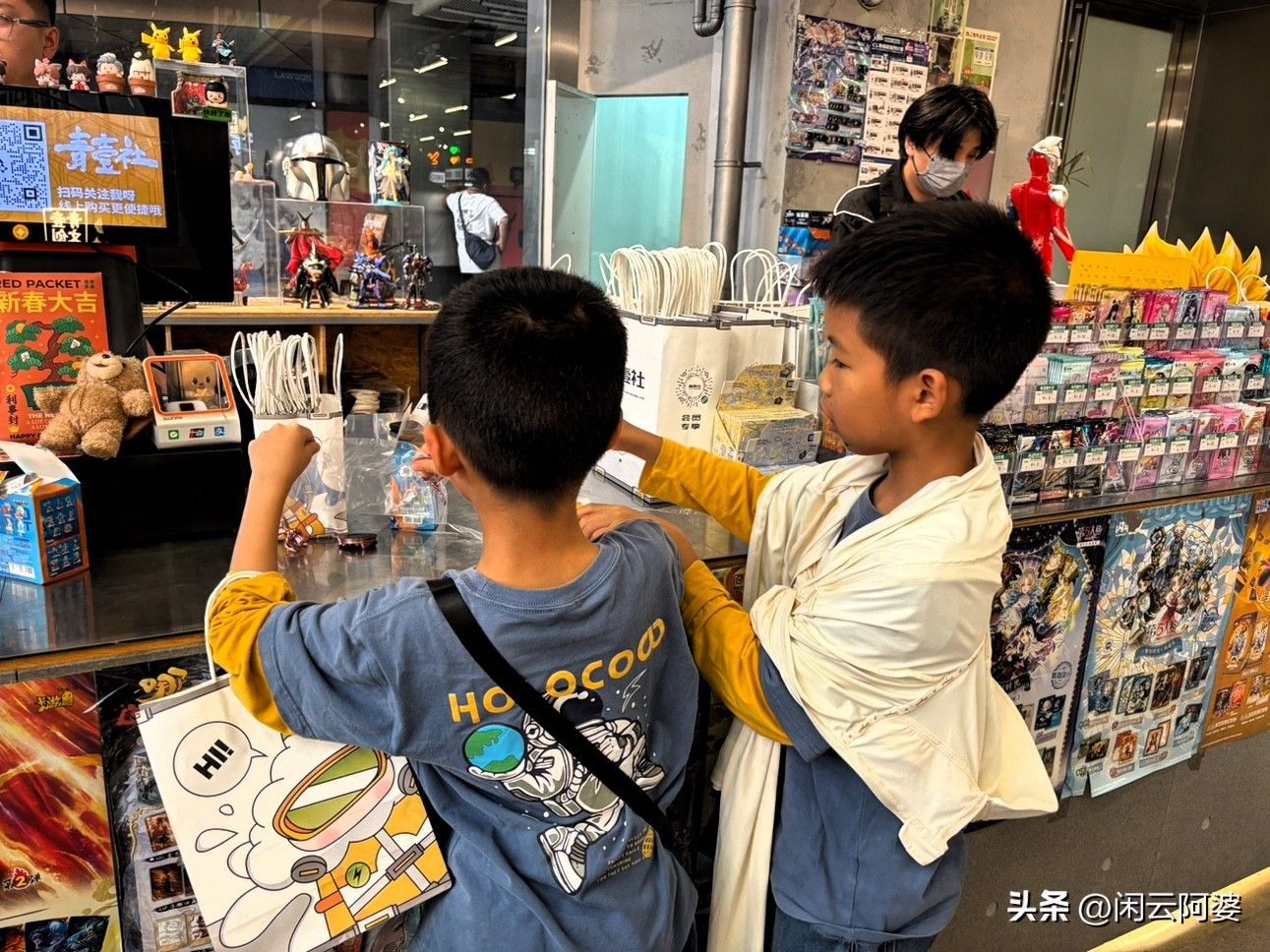 双胞胎小哥俩,欢呼雀跃,脖子上挂着小天才电子手表,里面积攒着他们存了许久的零花钱,后面还跟着妈妈和外婆两个提款机,底气十足。
