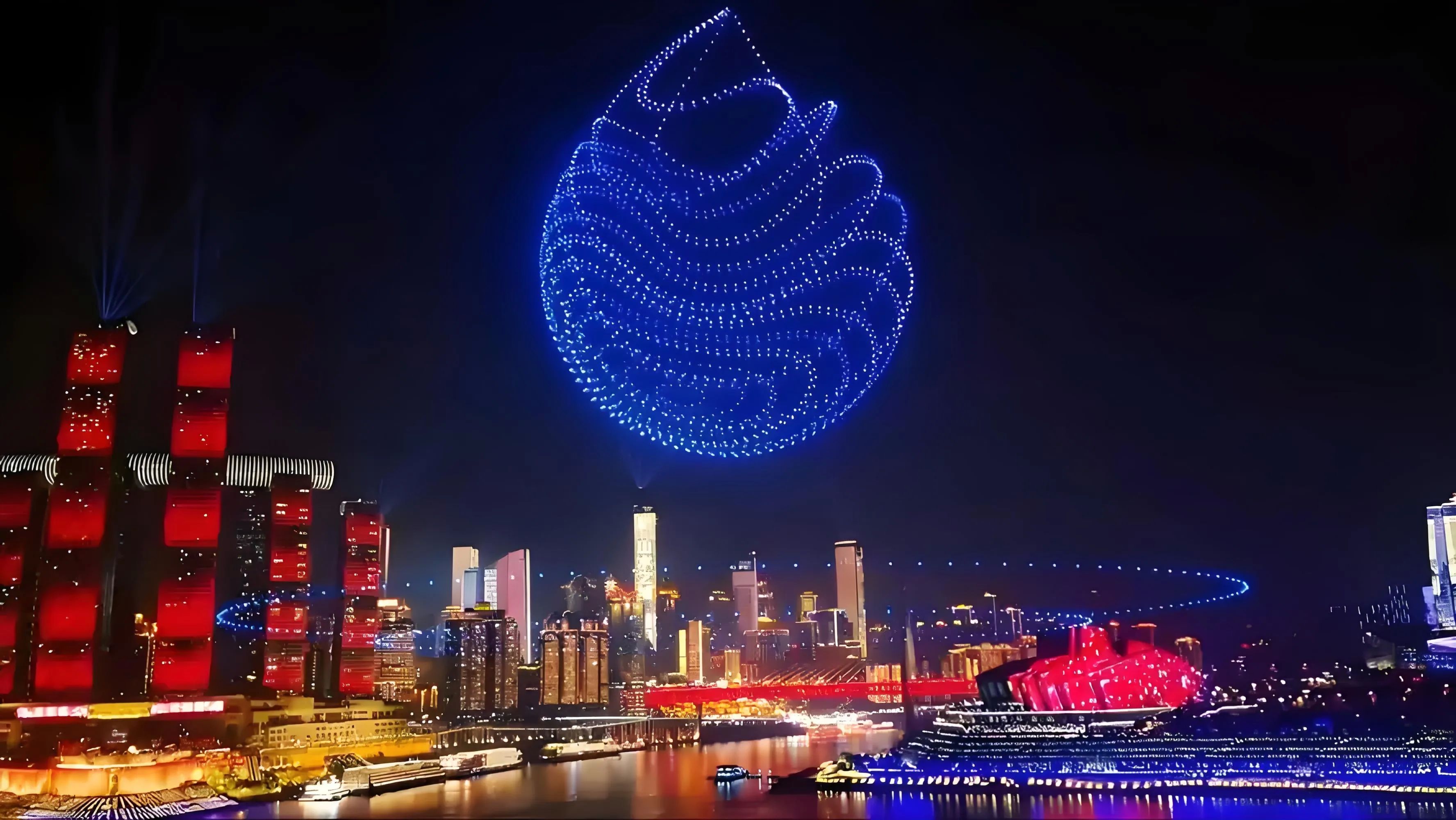 3. 重庆大剧院:夜晚灯光变幻的巨型“晶石”,江滩边拍洪崖洞+千厮门大桥+剧院同框镜面倒影。