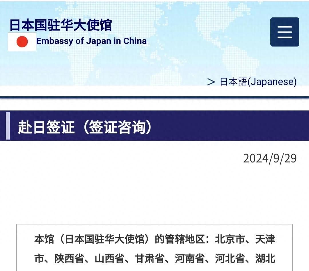 日本国驻华大使馆:北京、天津、陕西、山西、甘肃、河南、河北、湖北、湖南、青海、新疆、宁夏、西藏、内蒙;