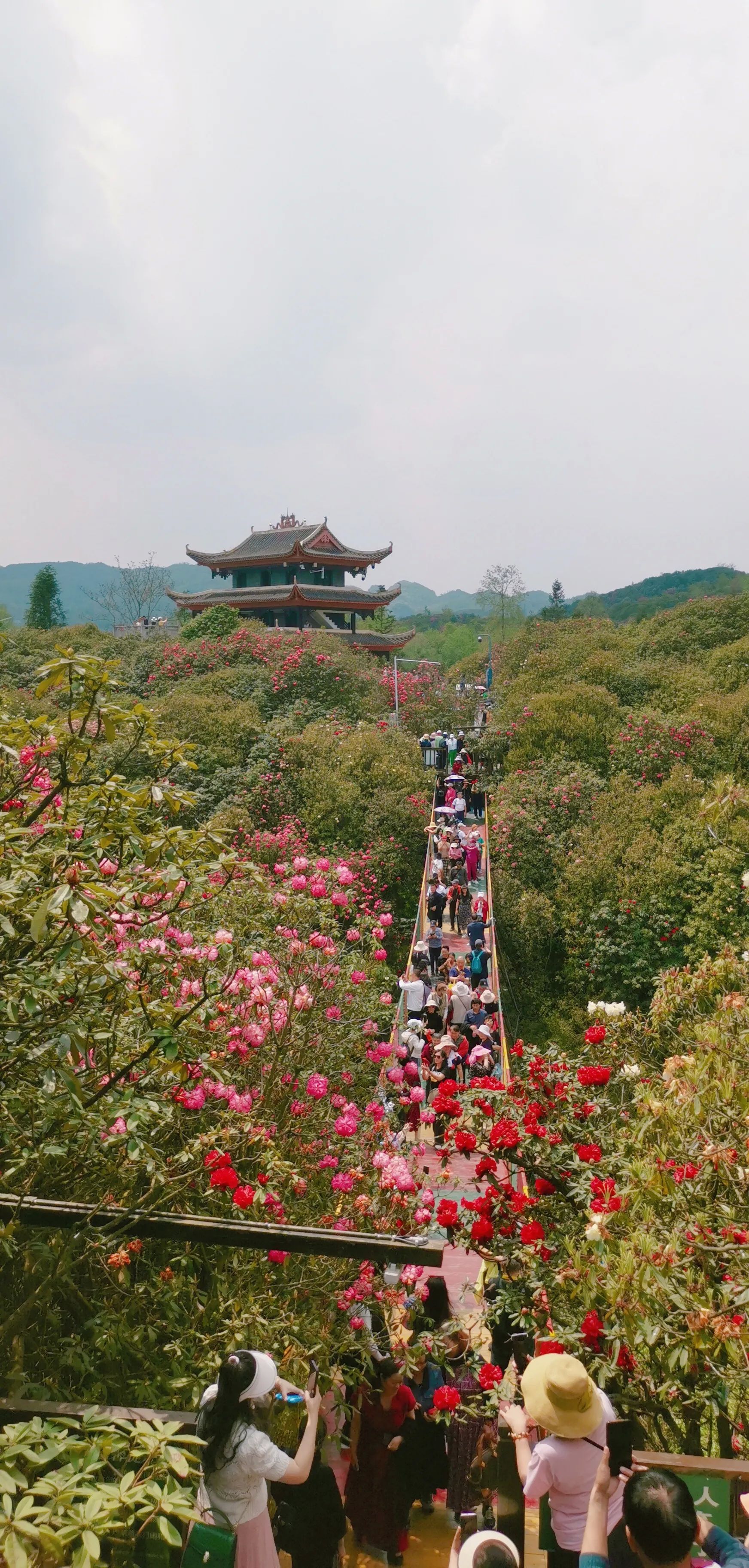 由于宣传做得好,国内井喷式旅游热情高涨,幸好错开了前两天周末的高峰限流,听说普底花开的早也开始在谢了,所以我来的是金坡景区,天气不错,微阴间或放晴,游人真是不少,不过正常流动没有拥堵,坐上景区观光车向山间进发,一路时不时看到绚烂的杜鹃花丛,虽没有连绵不断,却也是欣欣然山花烂漫,观光车停靠两个观景点,我分别走过百花坪、索玛花桥、马缨林、揽胜峰……看到不少身着亮丽彩服的彝族姐妹载歌载舞祭拜索玛花神,近距离观赏各色高山杜鹃的美态,据说这里有六十多种野生杜鹃,上百年的树龄,所以树形较高,花朵硕大,走近了大多只能仰望,放眼远观才能看到成片的天然花海,色彩缤纷花团锦簇,手机太难还原眼前的浓墨重彩,那些美不胜收的宣传片上的壮丽花海都是无人机专业镜头高处航拍所得,游人们就只能在几个观景台远眺无边美景,我且大饱眼福吧,不愧这“地球的彩带,世界的花园”美誉。
