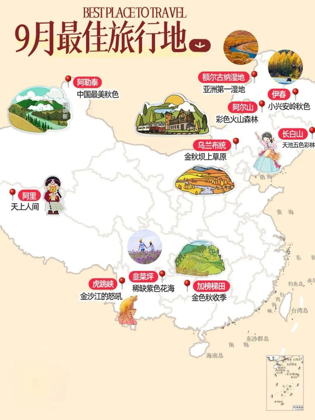 - 四川九寨沟:9月的九寨沟,彩林开始变色,湖水五彩斑斓。长海、五彩池、五花海等景点美不胜收,珍珠滩瀑布气势磅礴,宛如童话世界。