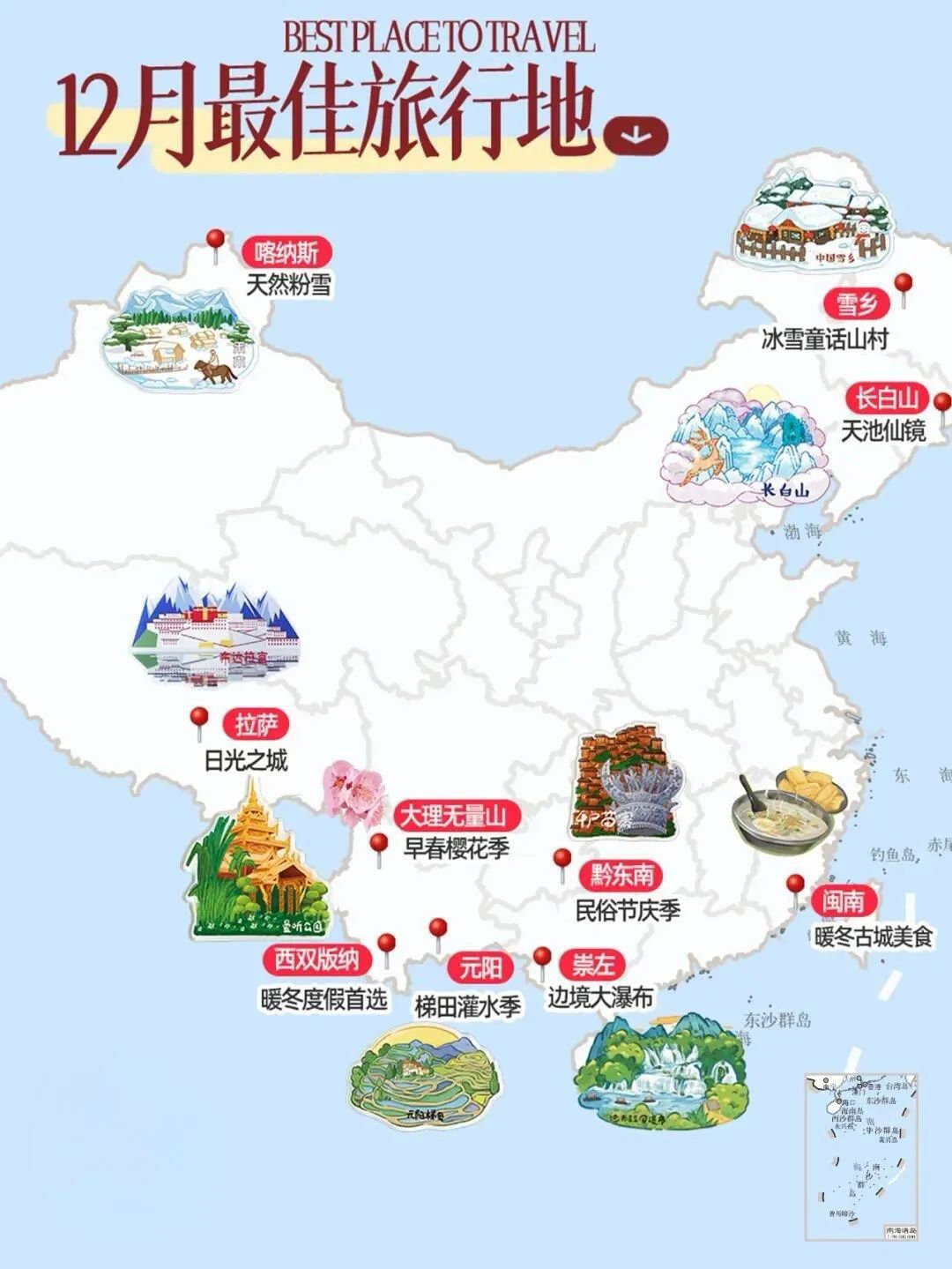 - 海南三亚:12月的三亚温暖如春,椰林树影,碧海蓝天。在亚龙湾、海棠湾享受阳光沙滩,还能去蜈支洲岛潜水,探索海底世界,躲避冬日严寒。