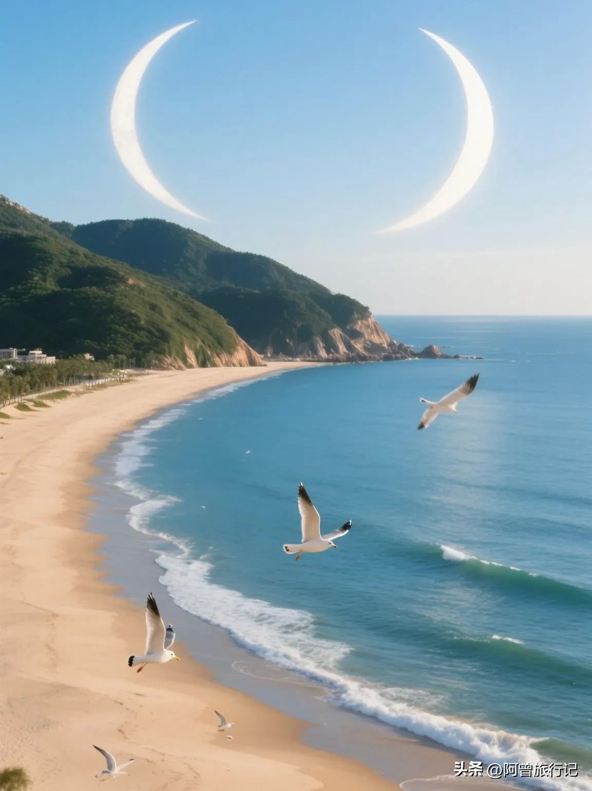 位于广东惠州惠东港口镇,因形似两轮新月得名。东海岸平缓适合观日出,西海岸礁石遍布是赏日落佳地,周边景点丰富。