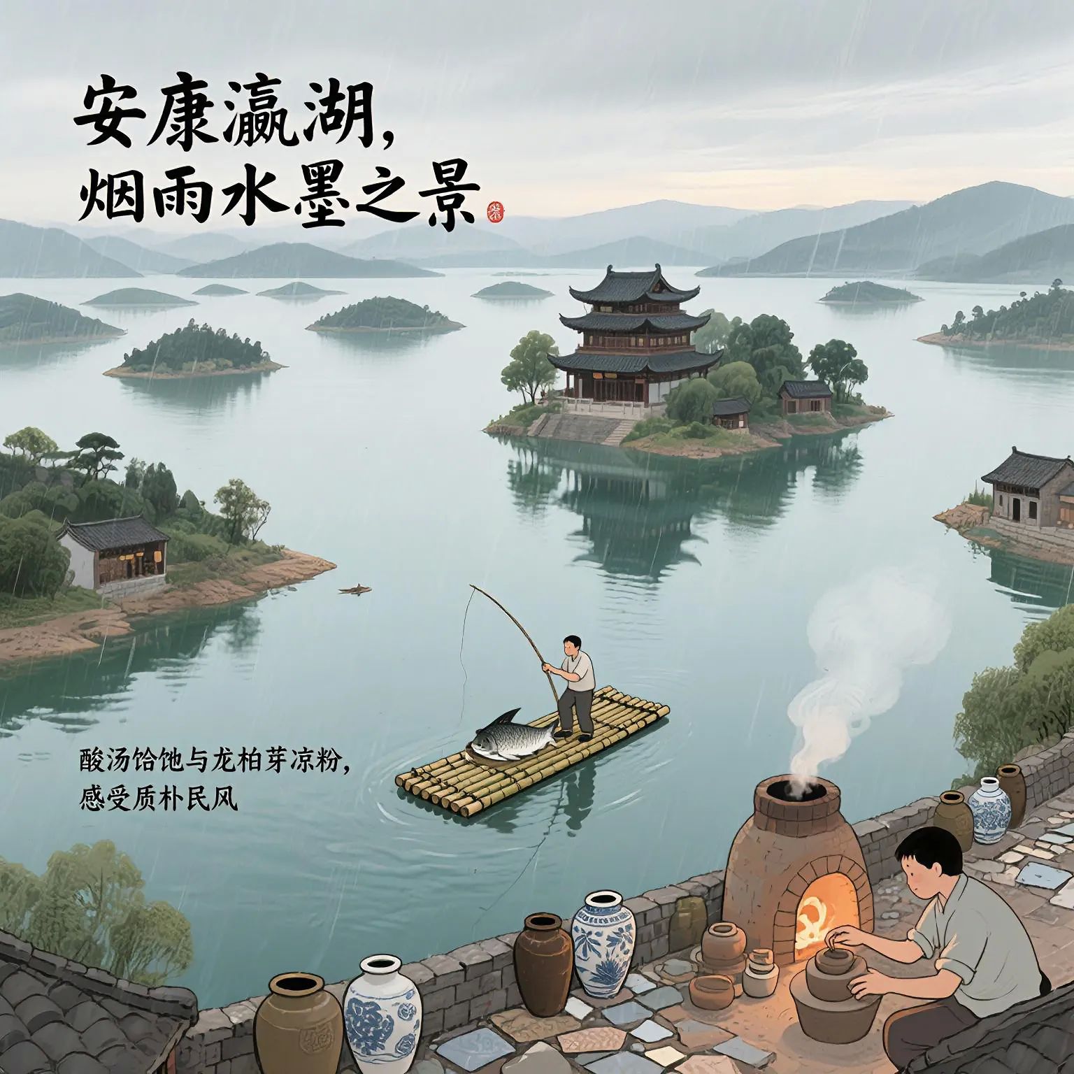 汉江上的“千岛湖”,岛屿星罗棋布,金螺岛仿唐建筑倒映水面如水墨画。乘竹筏垂钓富硒鱼,航拍视角可捕捉几何排列的岛屿群,阴雨天更显江南烟雨意境。