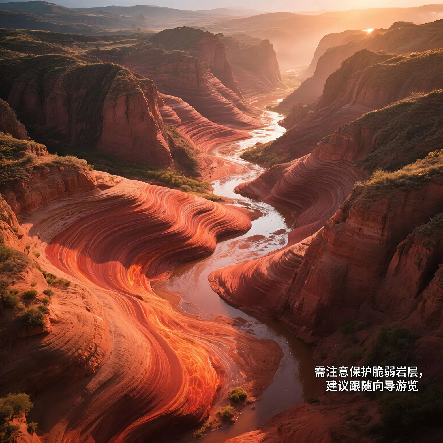媲美美国羚羊谷的丹霞秘境,亿年风蚀形成的红砂岩波浪纹理在阳光下如火焰流动,雨后色彩更显浓郁。推荐清晨或日落时分拍摄,无人机俯拍可捕捉层叠地貌的震撼全景。需注意保护脆弱岩层,建议跟随向导游览。