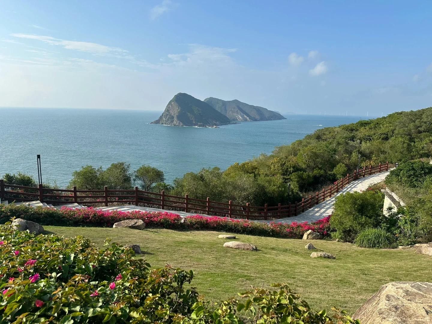 山顶鸟瞰全岛,山海小岛尽收眼底,沿途风景如画,机位:山盟海誓园拍蜜月阁全景