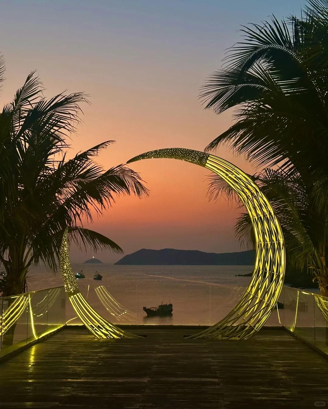 玻璃海+白沙滩,日落时粉紫色晚霞绝美,傍晚沿海栈道漫步,落日余晖洒身,氛围超赞,拍照美不胜收