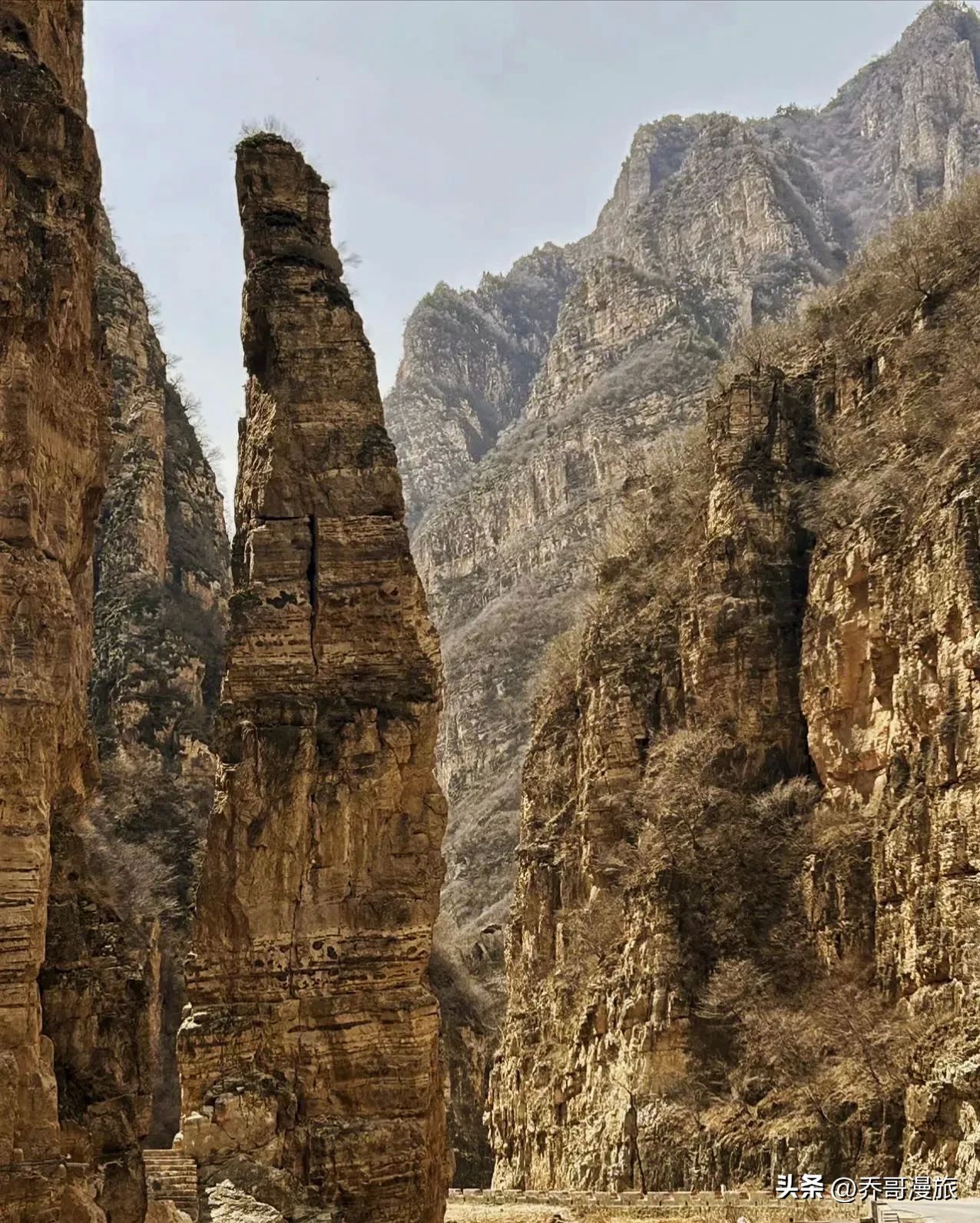 车如孤舟,行于山间,飘摇而渺小。一路下行,见一处村落有民宿还有揽客的招牌,想停下休息片刻,看似平地因没拉好手刹,车竟然溜向道路另一测,多亏我眼疾手快,及时点火着车,踩住刹车,吓了我一身冷汗。也算有惊无险吧,没敢停留,走不远就来到飞狐陉的绝美处,一片芦苇滩中一块巨大的石头,上刻“飞狐”二字。车在峡谷深处穿行,两旁峭壁绝立,遮天蔽日,颇有一种迎面而来的压抑感。飞狐陉峡谷深邃幽暗,如一条通向绝望之地的通道。山体的阴影透过车的天窗压迫进了驾驶舱,很多人把车就停在路边,影响了对面来车的通行,我小心翼翼把车开到一处宽阔点的地方停下来。谷底窄窄的通道上,很多游客打卡拍照。我仿佛看见列队前行的披铠甲的武士,三五成群的布衣百姓簇拥着前行。抬头望一柱石峰拔地而起,这就是名唤一炷香的景点吧,再往前方行驶,道路豁然开朗,原来我已经走出了飞狐陉。车行不太远,一片盆地出现在眼里,开到一个名叫北口村的地方,往左望是北太行的雄浑霸气,前望则是冀西北高原上的一座县城,那就是蔚县了吧。