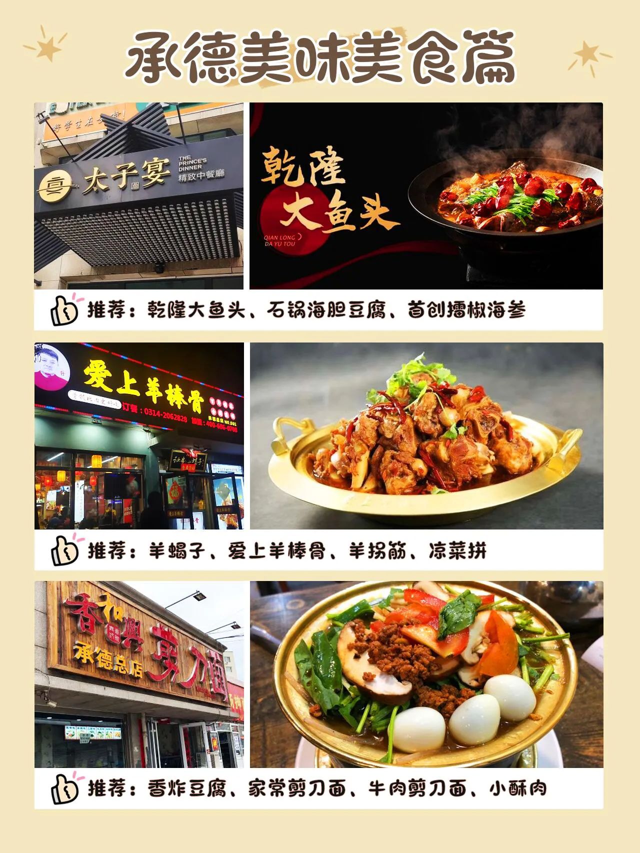 想吃精致中餐就选太子宴,乾隆大鱼头肉质鲜嫩,石锅海胆豆腐滑嫩鲜香,首创擂椒海参更是一绝。砣姐小吃(承德商厦店)里,杏仁茶香甜细腻,烧麦皮薄馅大,碗砣、炒疙瘩、豆腐脑也都值得一试。