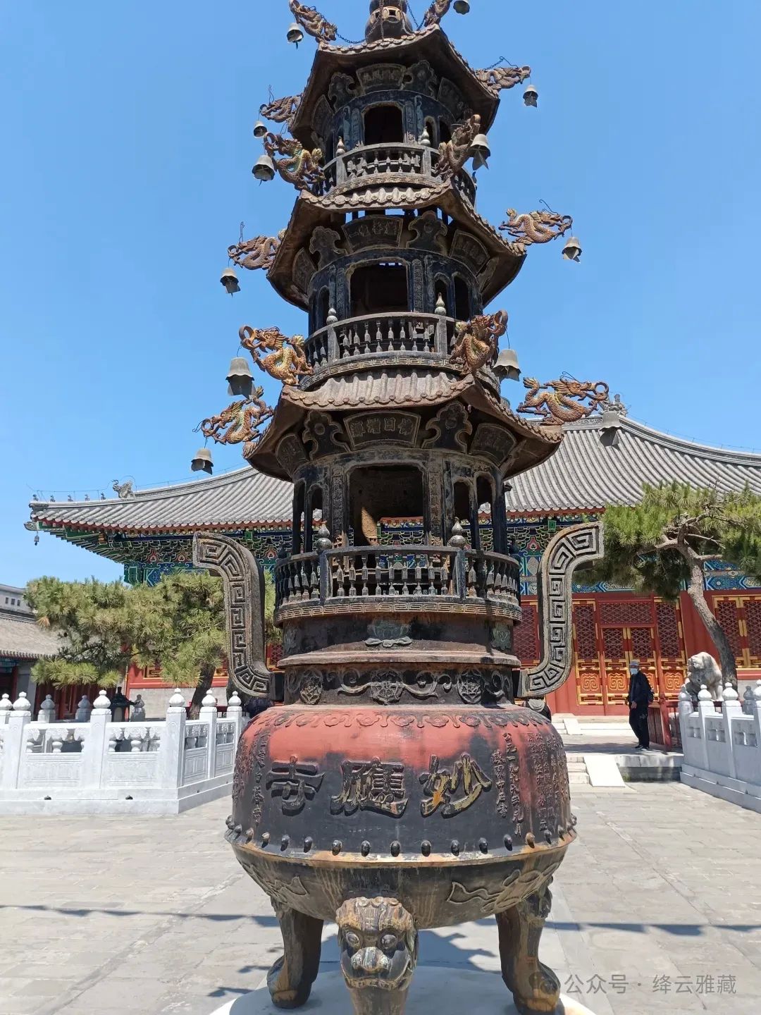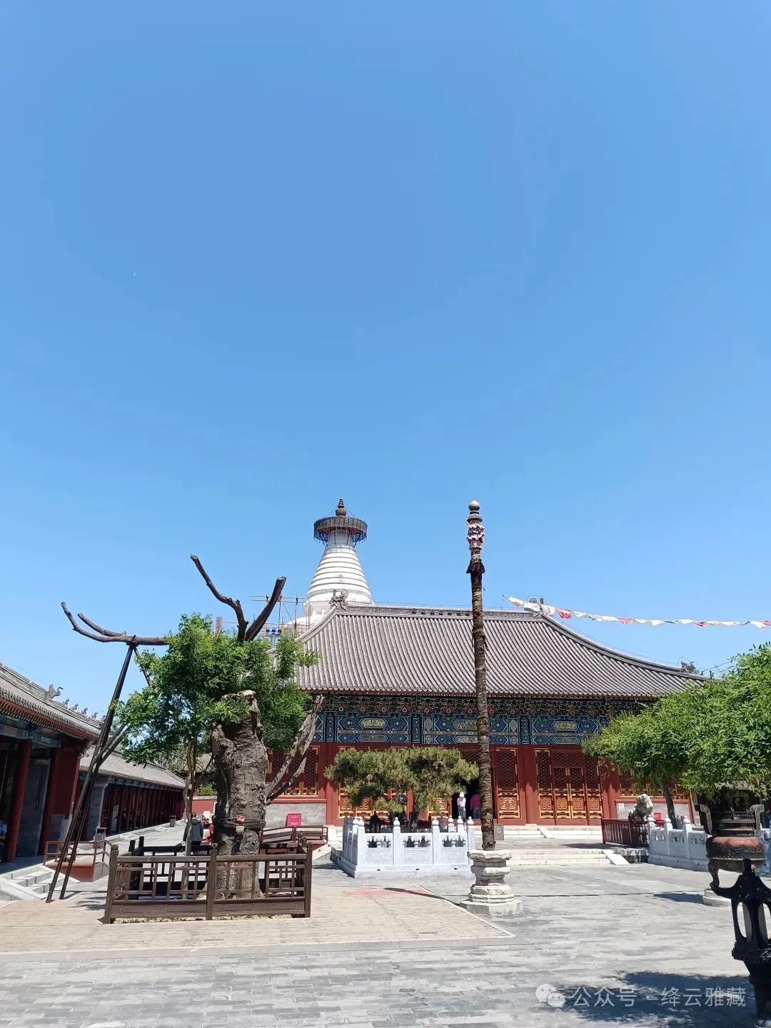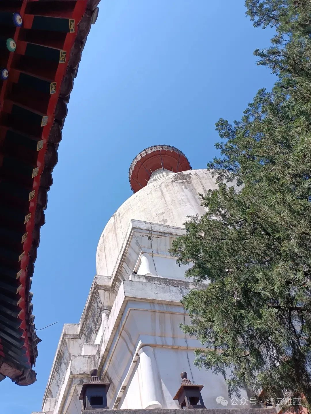 走进寺门,第一眼就被这座大白塔震撼到了!整个塔身有51米高,差不多17层楼那么高。底部是正方形的塔基,一层叠着一层往上收,就像给白塔穿了条蓬蓬裙。中间圆滚滚的塔身特别可爱,像倒扣着的大瓷碗,洁白的墙面在阳光下亮闪闪的。最上面是造型精致的塔刹,有层层叠叠的金属圆环,还有像大伞一样的华盖,华盖边缘挂着一圈铜铃铛,风一吹就叮叮当当响,特别好听。