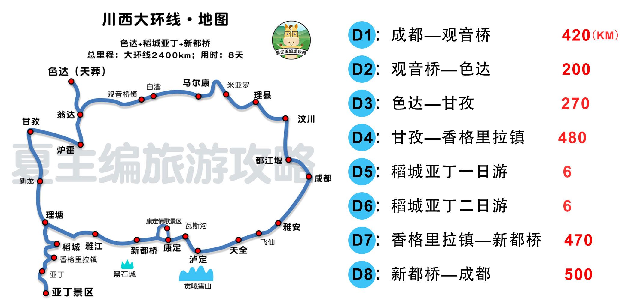 川西各大线路,如川西大环线、川西小环线、川北九寨沟若尔盖环线、色达小环线、稻城亚丁专线等具体路书,每天行程、景点、住宿地安排等,大家可参考《专栏》,结合文字路书了解详情。