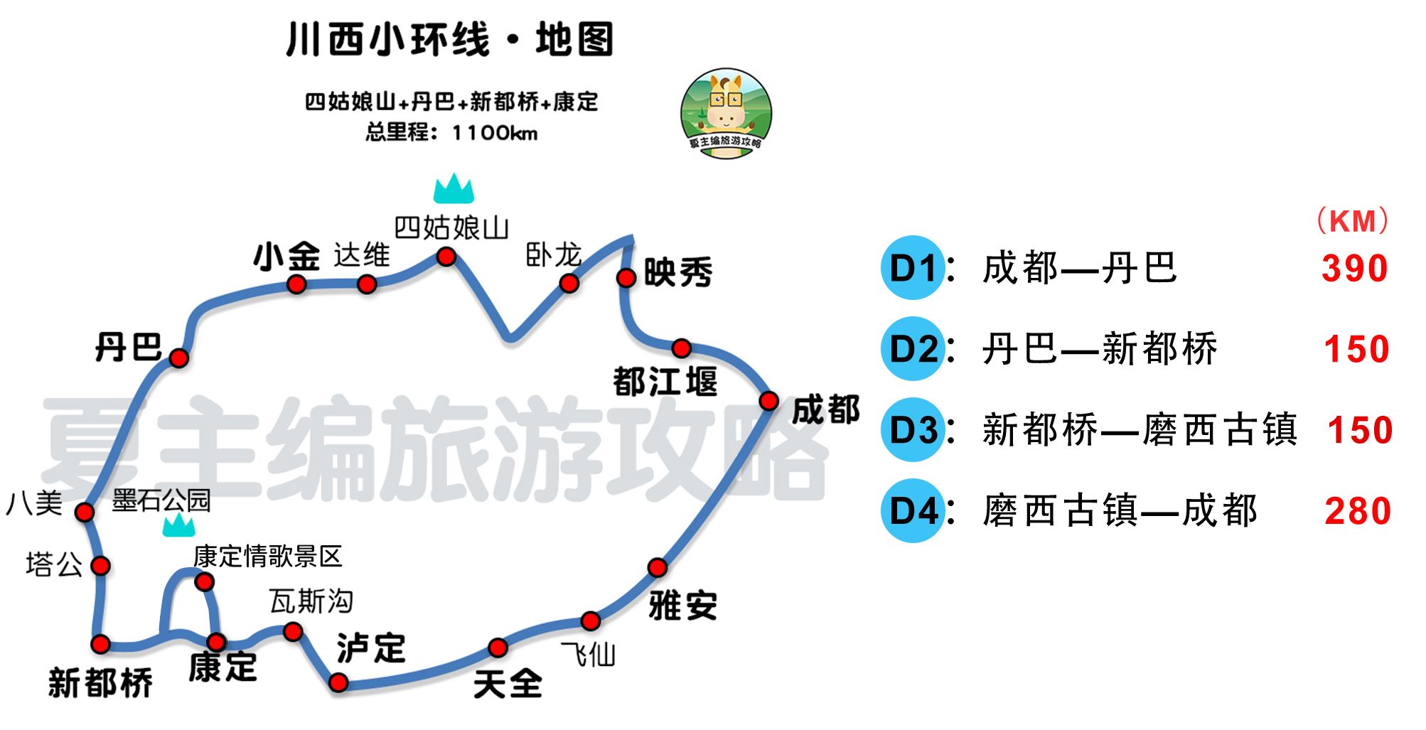原本川西大环线“成都G317观音桥镇”的线路,改成了“成都G350观音桥镇”。修改后的线路,经过了G350熊猫大道,自然风光更加丰富多姿了,可多游玩卧龙自然保护区、四姑娘山、丹巴藏寨、碉楼等景观。
