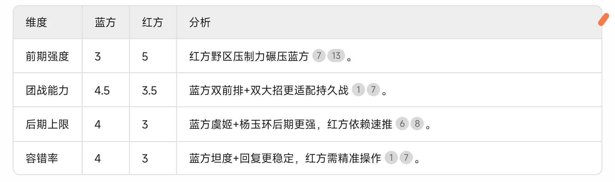 戈娅后期输出爆炸,若红方能速推节奏,蓝方难以拖到虞姬成型 。