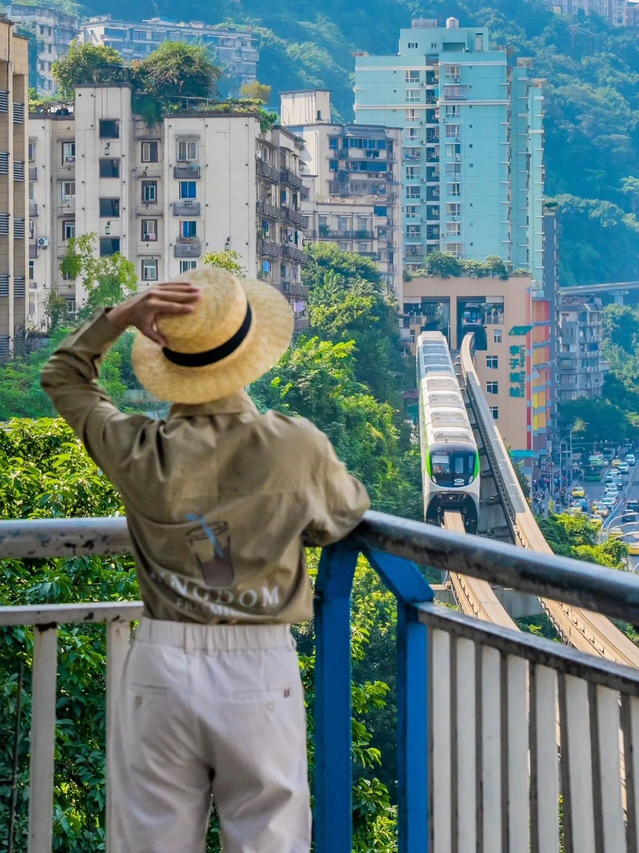 别再去人挤人的李子坝观景平台了!这个新地方能近距离和轻轨合影,人少又出片。导航到“大田湾小学”,左手边往下走,走到“揽胜亭”就到啦。