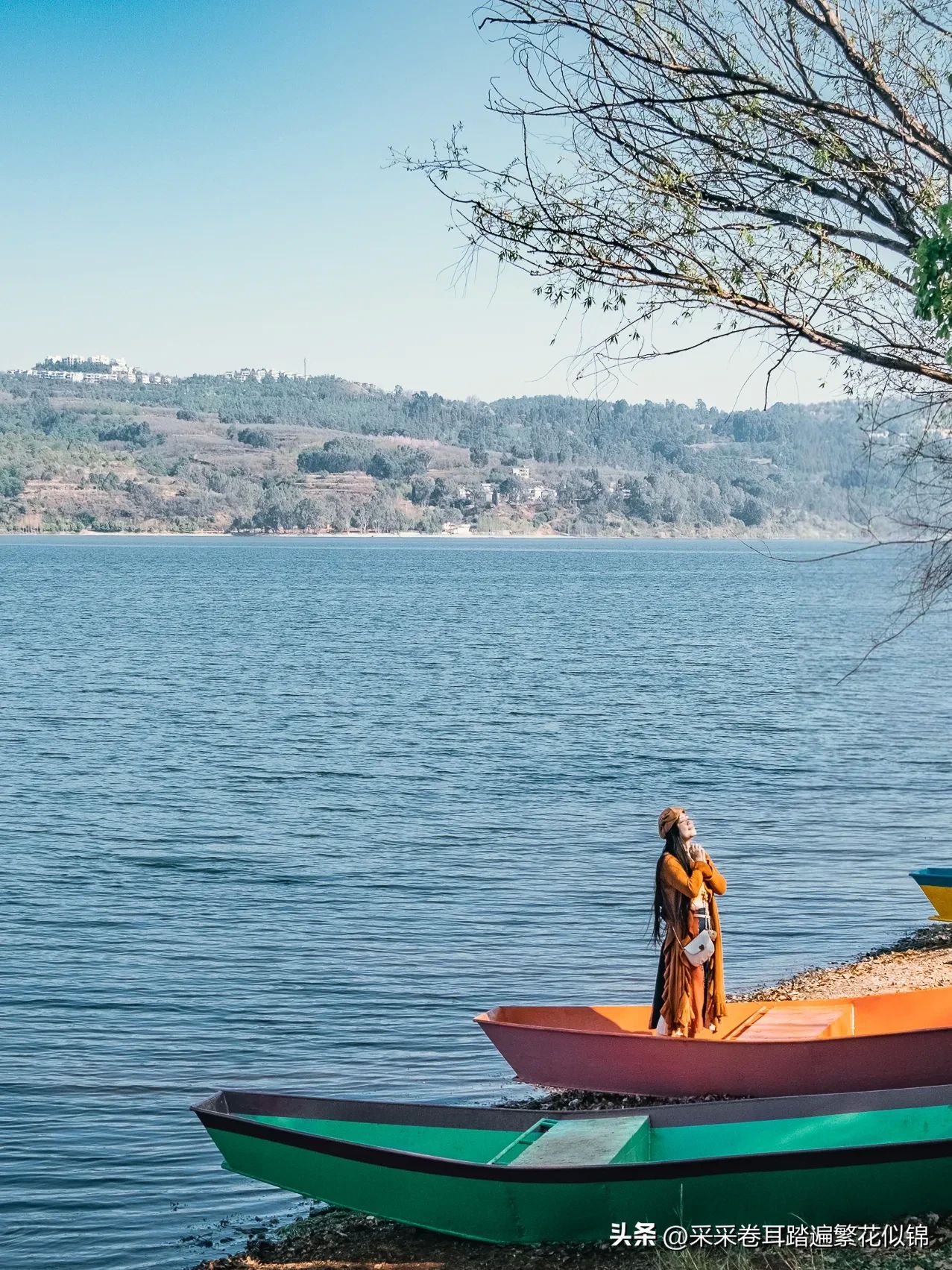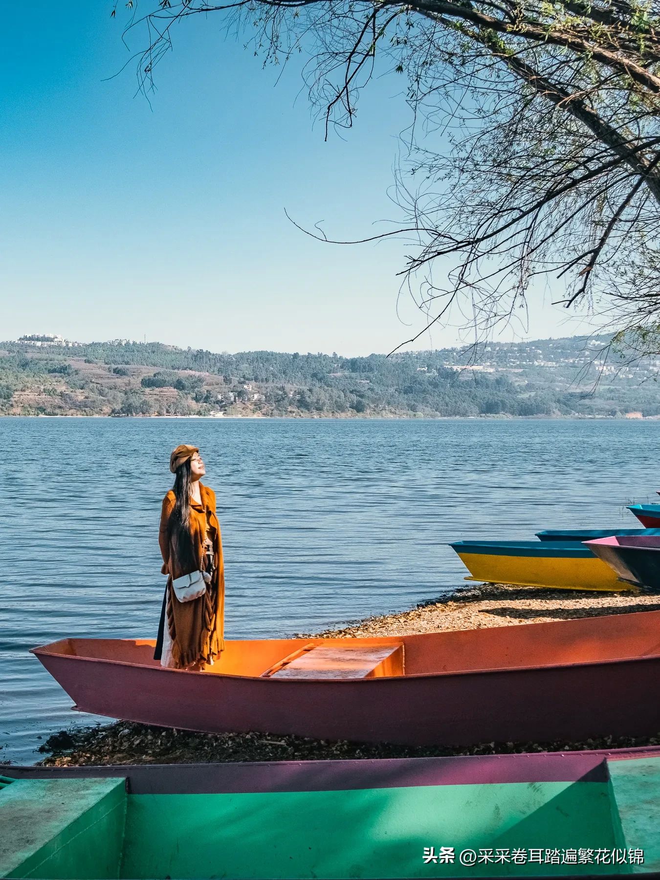 靠近沙滩附近的湖面,有靠岸闲置的一排彩色小船。走上其中之一,以阳宗海为背景,彩船为前景,适时加入一些元素(如朝向彩船的树枝)作为活泼画面的元素。