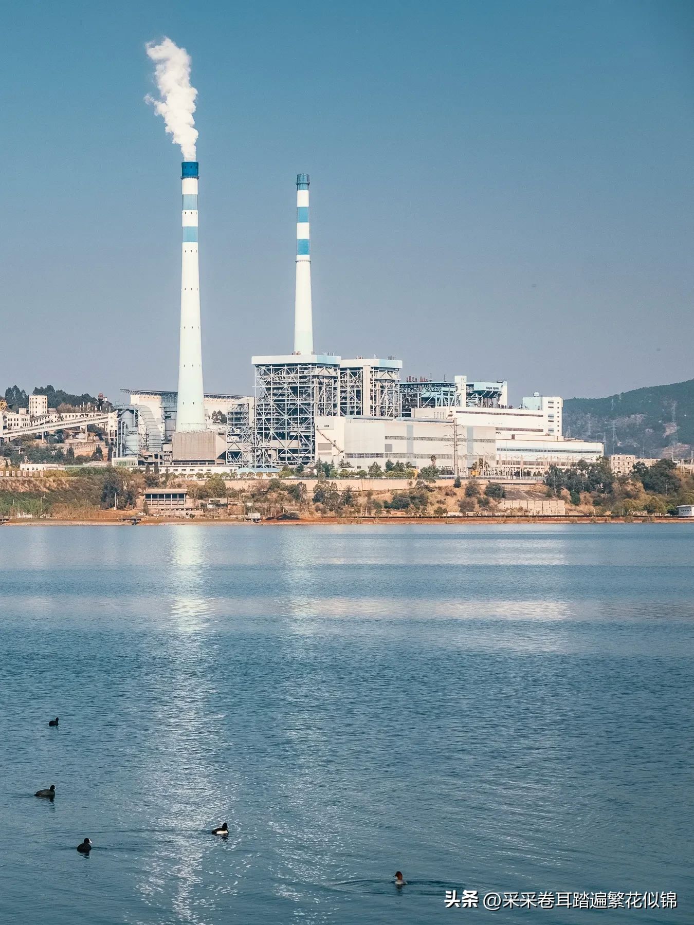 -湖对岸烟囱里冒着白烟正在生产的工厂。