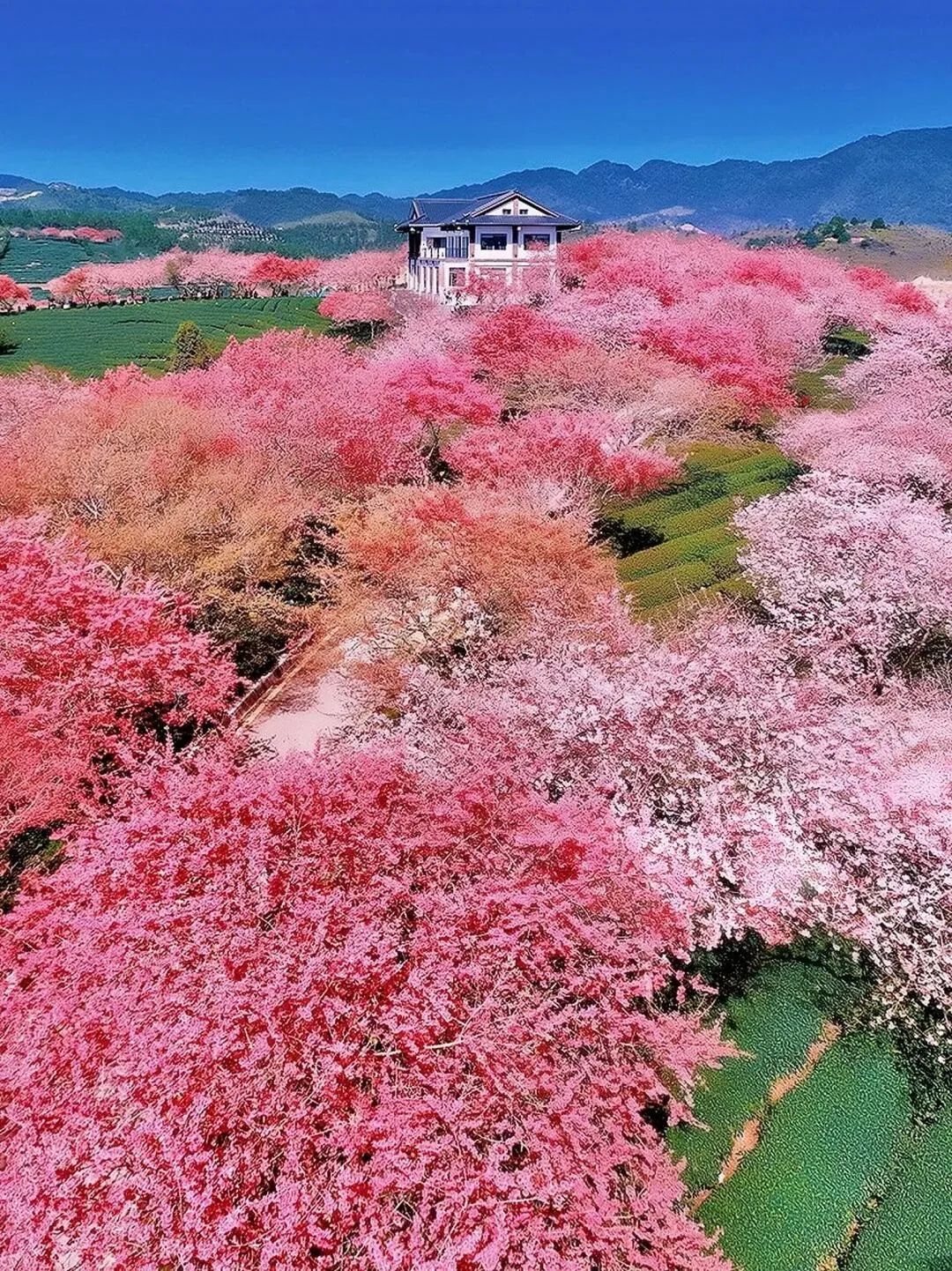 - 芳菲台看日出,台品茶楼航拍樱花茶园