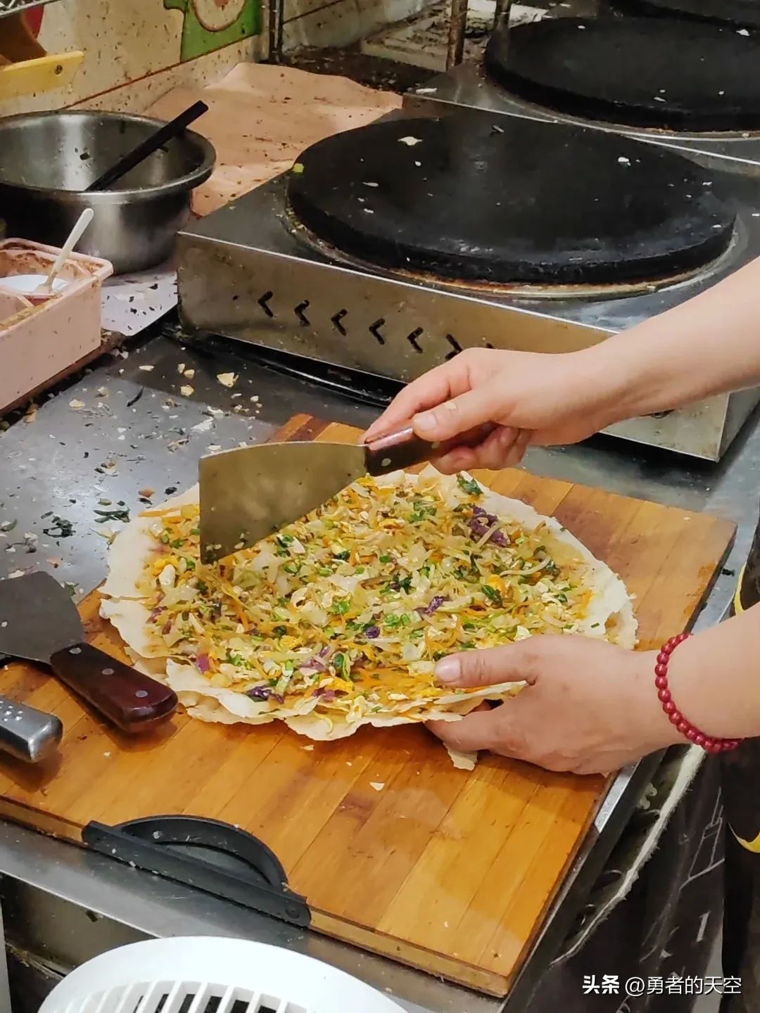 只见她在平鏊子上铺一张薄煎饼做底,把这些拌好的菜铺在上面,然后上面再盖一张薄煎饼,然后两面翻煎变色,就把里面的菜就煎熟了,看着外脆内香,我们足足等了有快一刻钟,才把菜煎饼拿到手,老板娘把一份煎饼切了三段。