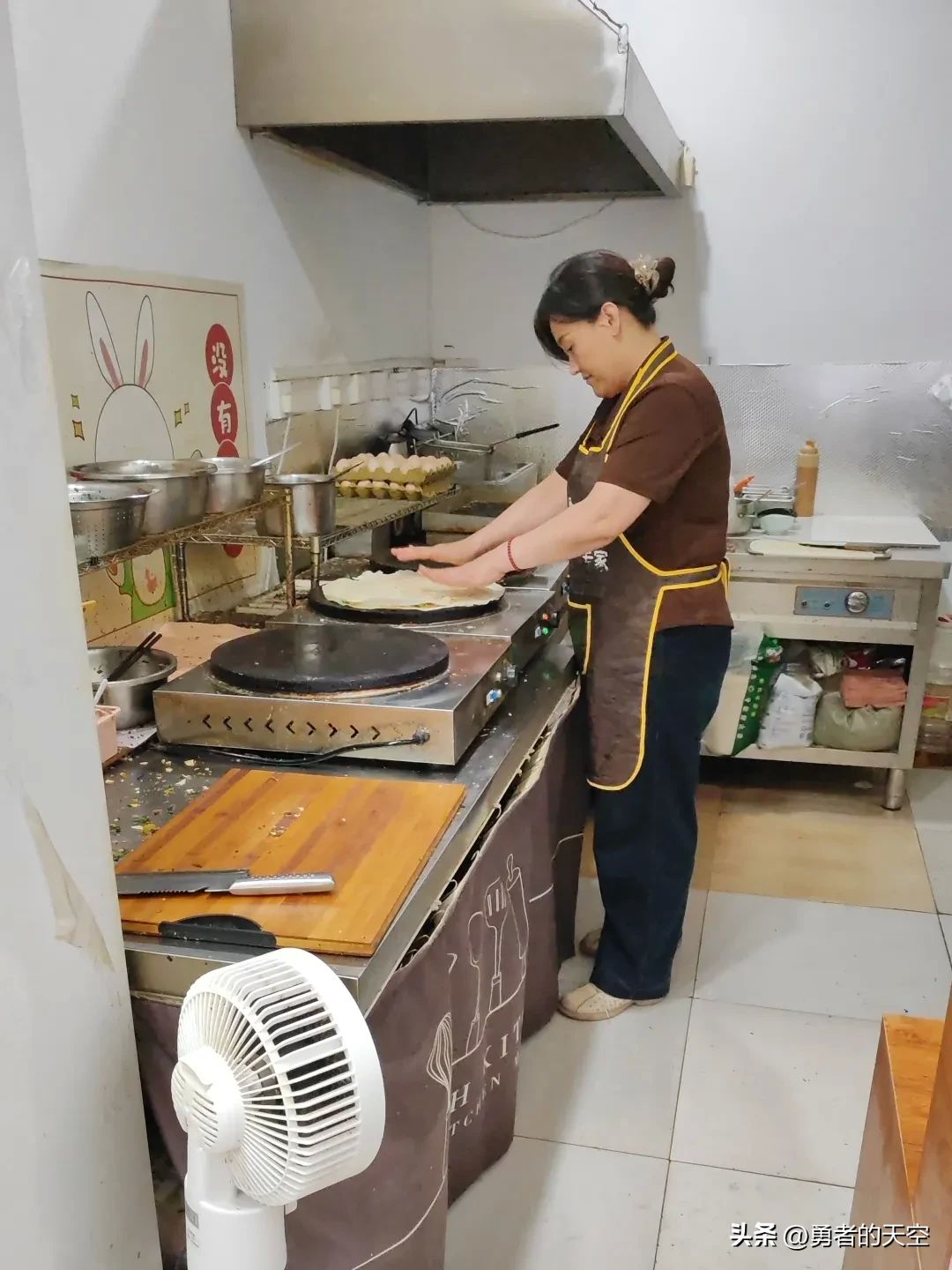 我和媳妇到了菜煎饼店,发现店里摆着一盘一盘的素菜,旱萝卜丝,胡萝卜丝,豆芽等等十多种,我们点了一份菜煎饼,外加一个鸡蛋,老板娘开始娴熟用小盆装入素菜,加入调味料和少许面粉开始搅拌。