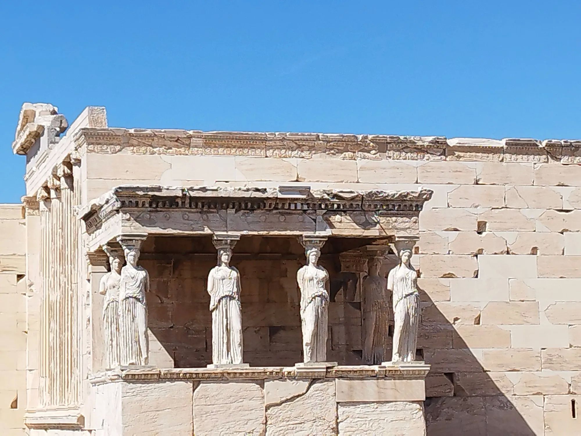 离开帕台农神庙,继续探索卫城的其他景点。走过一片开阔的广场,来到了厄瑞克提翁神庙。这座神庙以其独特的女像柱而闻名,五位女神像稳稳地支撑着阳台,宛如守护神般俯视着周围。她们的姿态优雅而庄重,仿佛在向我展示着古希腊女性的美丽与力量。站在这里,能感受到一种穿越时空的力量,仿佛回到了那个充满神话与传奇的时代。