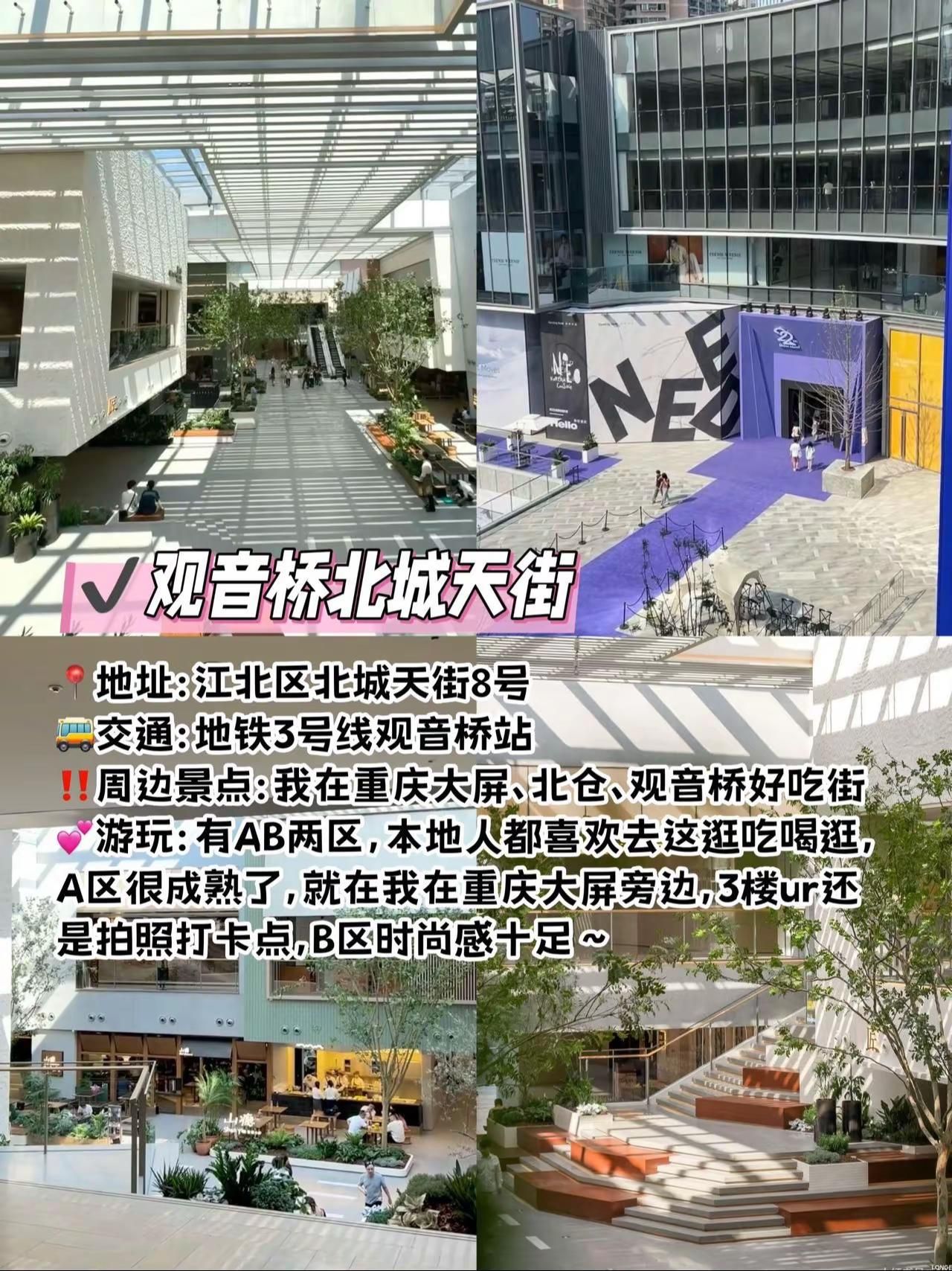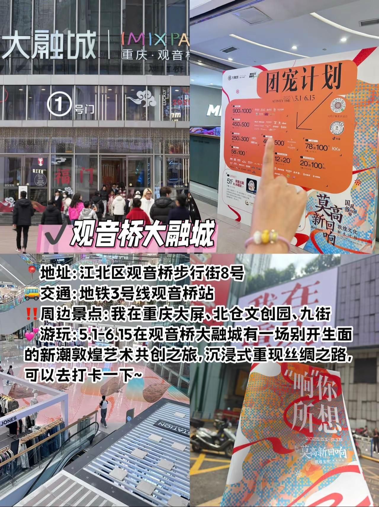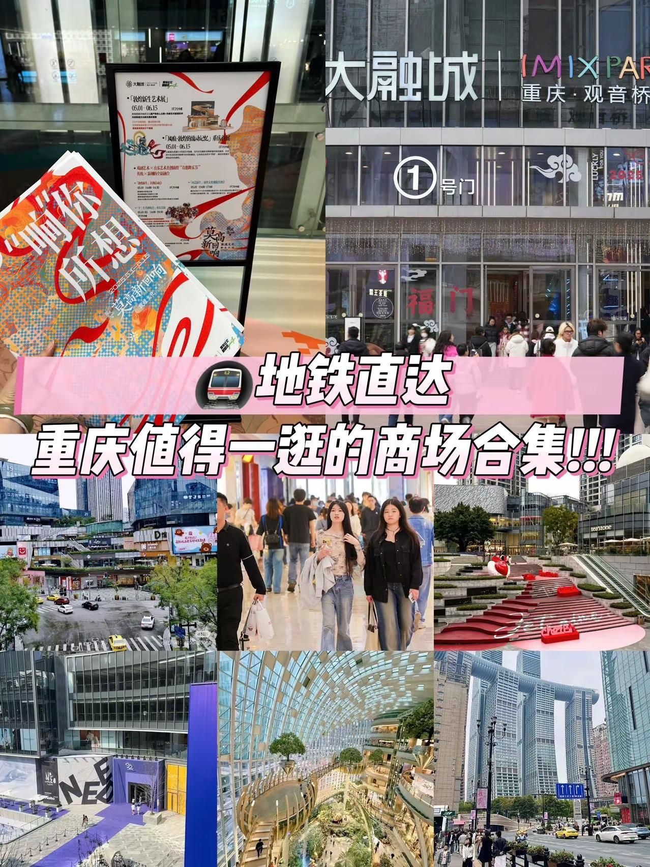 地铁直达,重庆值得一逛的商场合集!!!地铁直达,重庆值得一逛的商场合集!!!在重庆玩,给大姐分享几个本地人都觉得好逛好玩好拍的商场!快码住,来重庆直接跟着玩儿!·观音桥大融城地址:江北区观音桥步行街8号交通:地铁3号线观音桥站周边景点:我在重庆大屏、北仓文创园、观音桥好吃街、九街游玩:5.1-6.15在观音桥大融城有一场别开生面的新潮敦煌艺术共创之旅,沉浸式重现丝绸之路,可以去打卡一下~·来福士:地址:渝中区朝天门接圣街8号交通:地铁1号线朝天门站周边景点:解放碑、朝天门、洪崖洞、白象居、下浩里老街、龙门浩老街游玩:在这里可以逛街购物,还可以打卡两江交汇的景色,周边拍照机位也多。·万象城:地址:九龙坡区谢家湾55号交通:地铁2号线谢家湾站周边景点:重庆动物园、李子坝、鹅岭、半山崖线游玩:逛街购物买买买,大牌蛮多的,定期还有各种艺术展·光环购物公园:地址:渝北区湖彩路118号交通:地铁5号线光环店周边景点:没有旅游打卡点游玩:来这里主要就是拍拍拍,森林秘境被搬进了商场里·北城天街地址:江北区北城天街8号交通:地铁3号线观音桥站周边景点:我在重庆大屏、北仓文创园、观音桥好吃街、九街游玩:有AB两区,本地人都喜欢去这里吃喝逛·龙湖时代天街:地址:渝中区长江二路174号交通:地铁1号线石油路站周边景点:重庆动物园、李子坝、鹅岭、半山崖线游玩:在这里吃喝玩乐都可以安排上,逛街购物吃喝密室玩乐都一应俱全! #重庆商城 #网红打卡地 #重庆旅行 #观音桥大融城 #观音桥旅游攻略