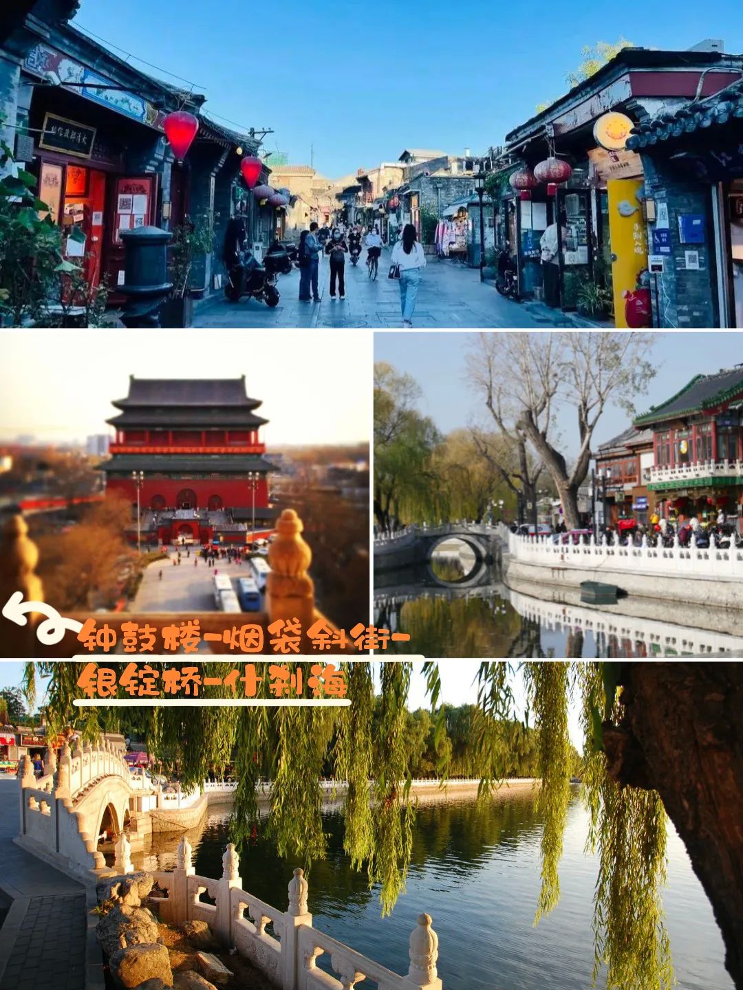 途径象征北京历史更迭的钟鼓楼,蕞老商街烟袋斜街,什刹海观两岸垂柳。