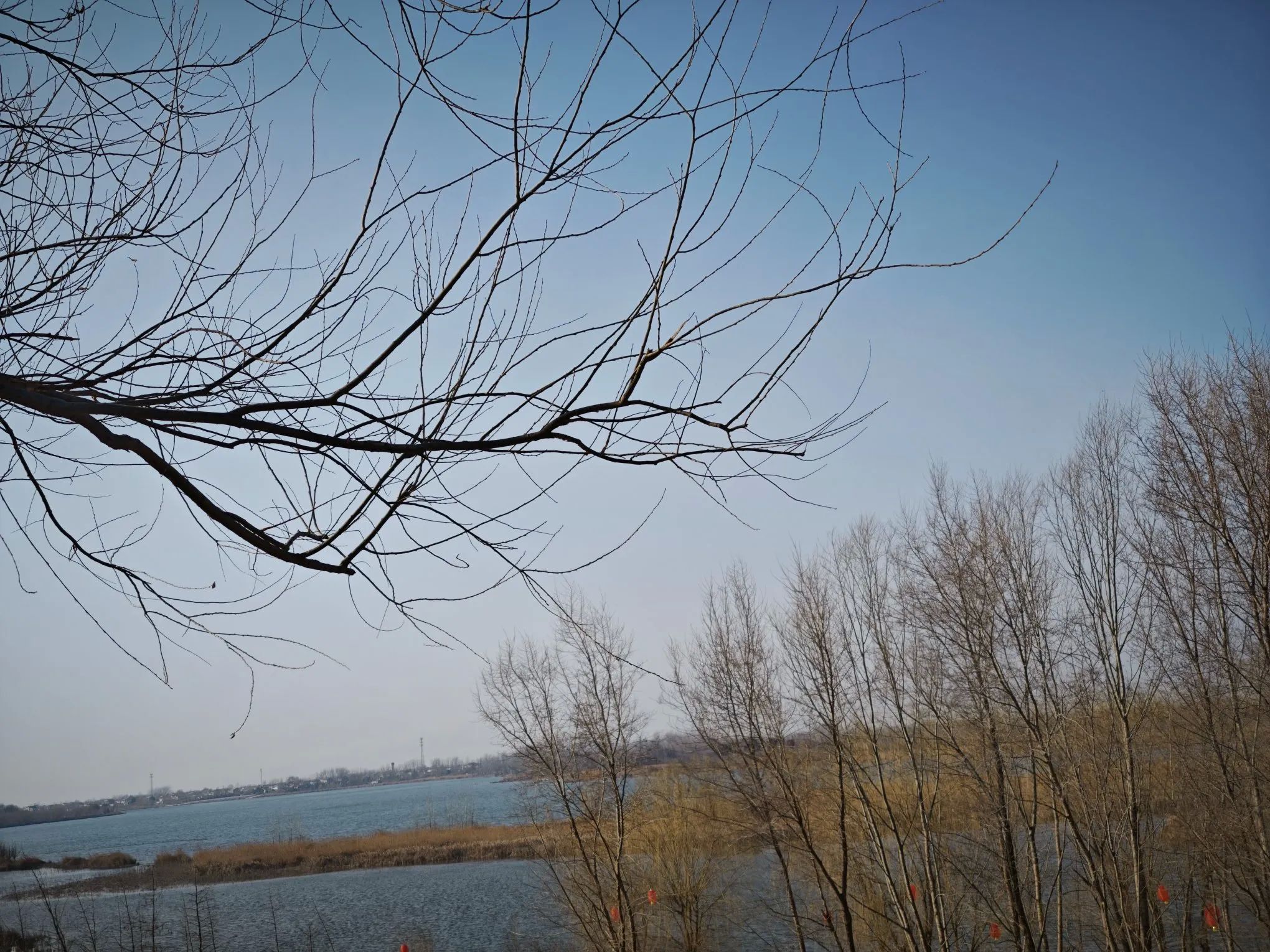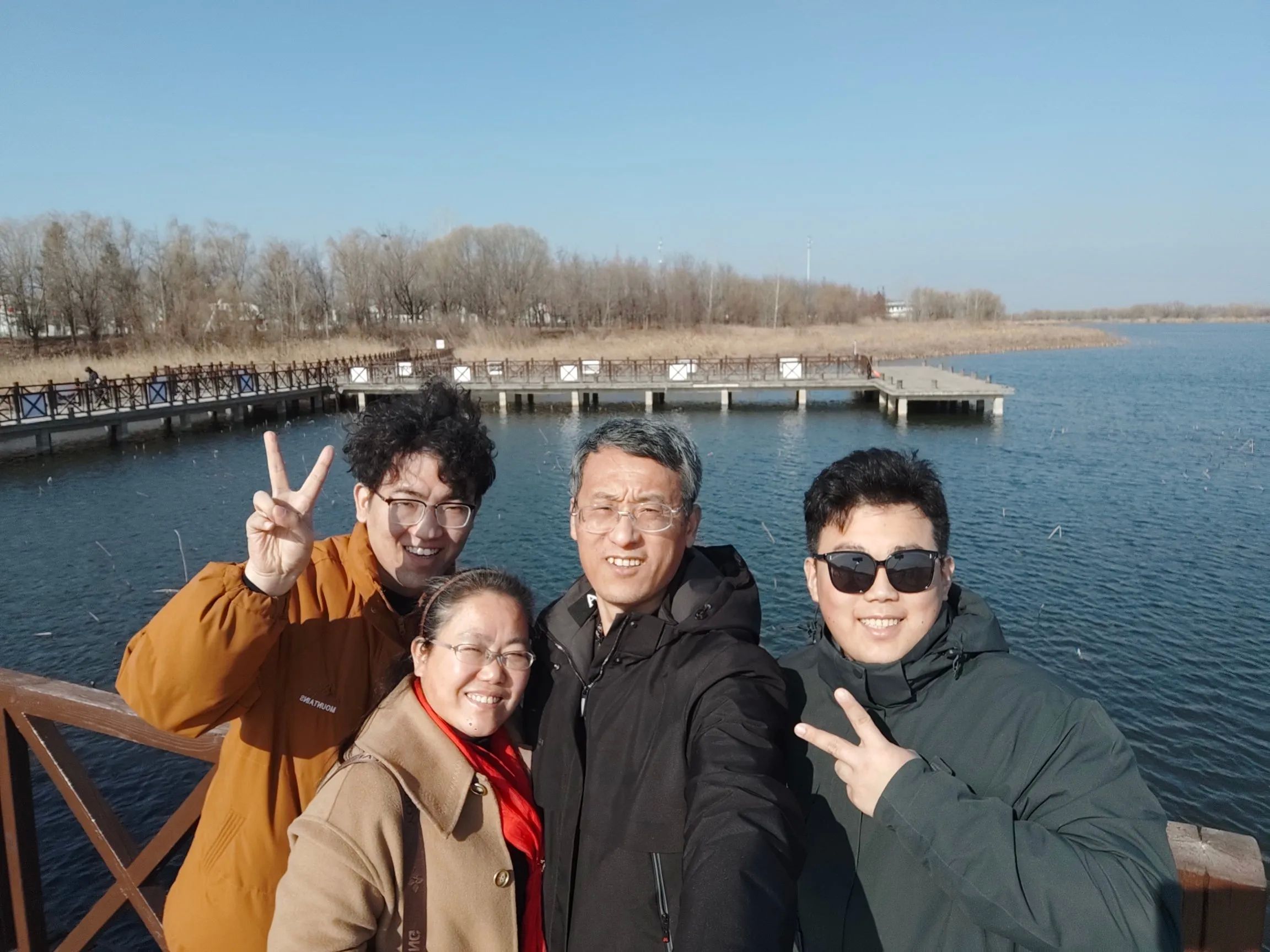 立春刚过,湿地公园显得萧索落寞:到处都是干草,树,大多也是光秃秃的,绿意极少。脚下的栈道也是这儿少一根 ,那儿缺一块的。但是,湿地视野很开阔,到处都是水,这儿一池水,那儿一大片。远远望去,水有点蓝,微风吹拂,波纹荡漾。近处几只叫不上名字的野鸭游来游去,悠闲的很,远处的几只你追我赶,一下钻入水下中,一会露出水面,嬉戏打闹。我们在这儿留了张合影。小儿子戏称哥哥是苏北小陈奕迅,大儿子笑称弟弟是胖子阿炳。一家人笑做一团。
