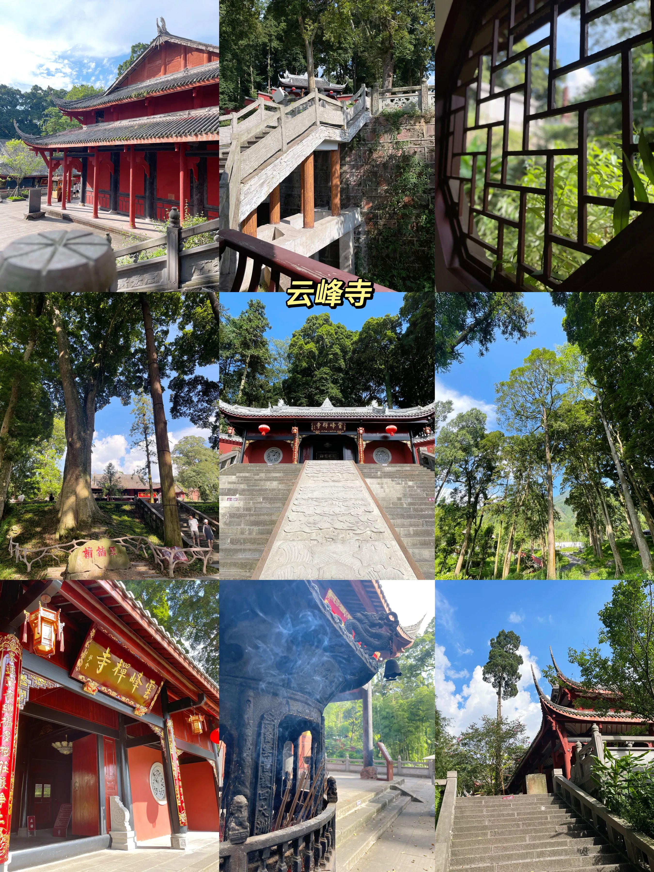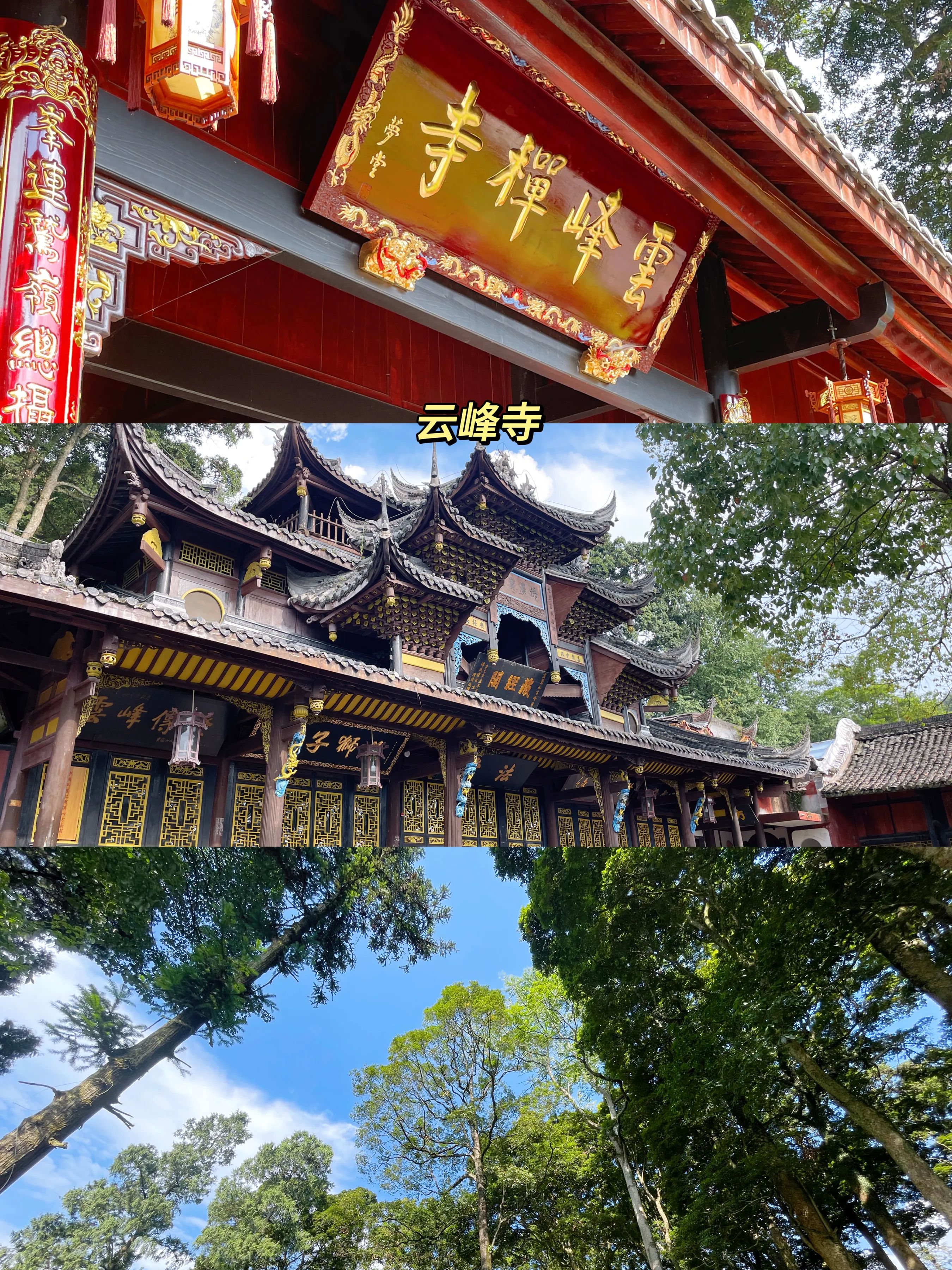 云峰寺内的古桢楠林被称为“中国最美桢楠林”,有200多棵古树,尤其是天王殿门口的两棵“中国桢楠王”,已经有1700多年树龄