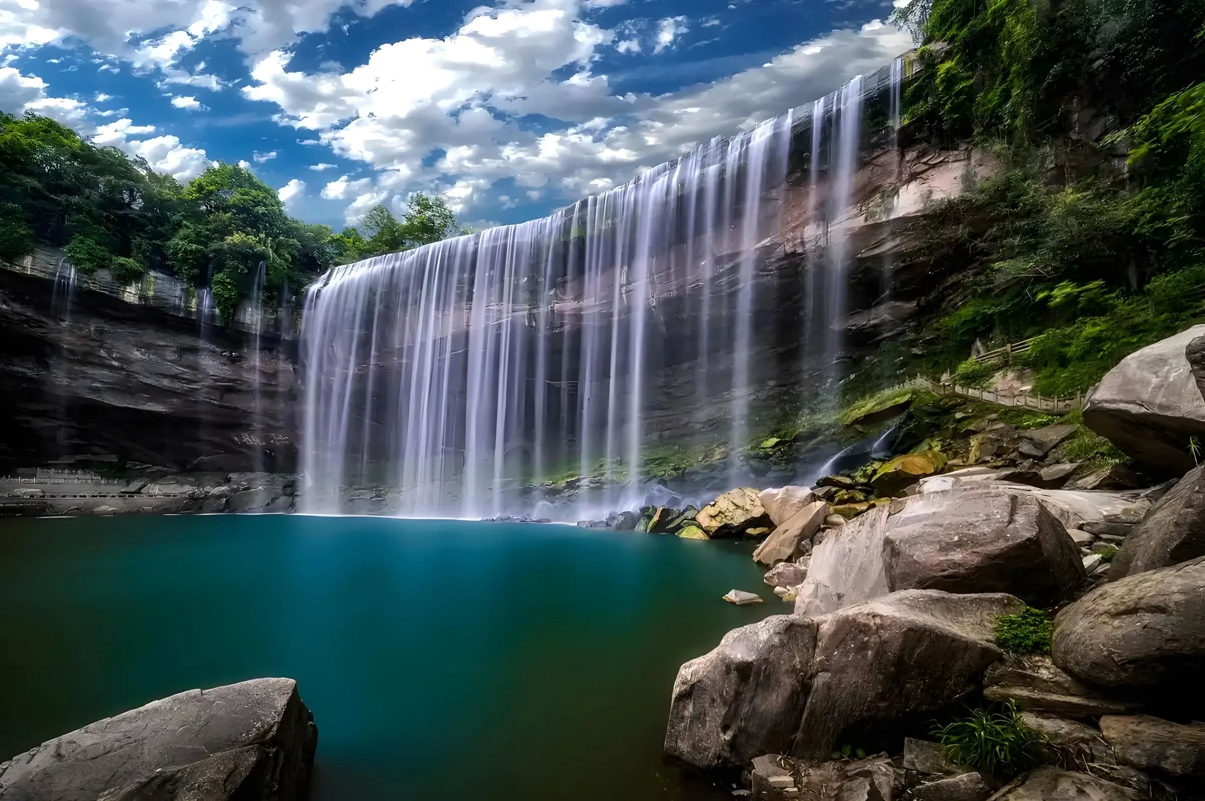 - **亮点**:亚洲第一宽瀑布“青龙瀑布”,宽达151米,可在观音古洞远眺或穿行水帘洞近距离感受水雾磅礴。景区内还有甘宁将军墓、何其芳故居等人文景点,建议体验“丛林飞车”俯瞰全景,或乘竹筏观瀑。