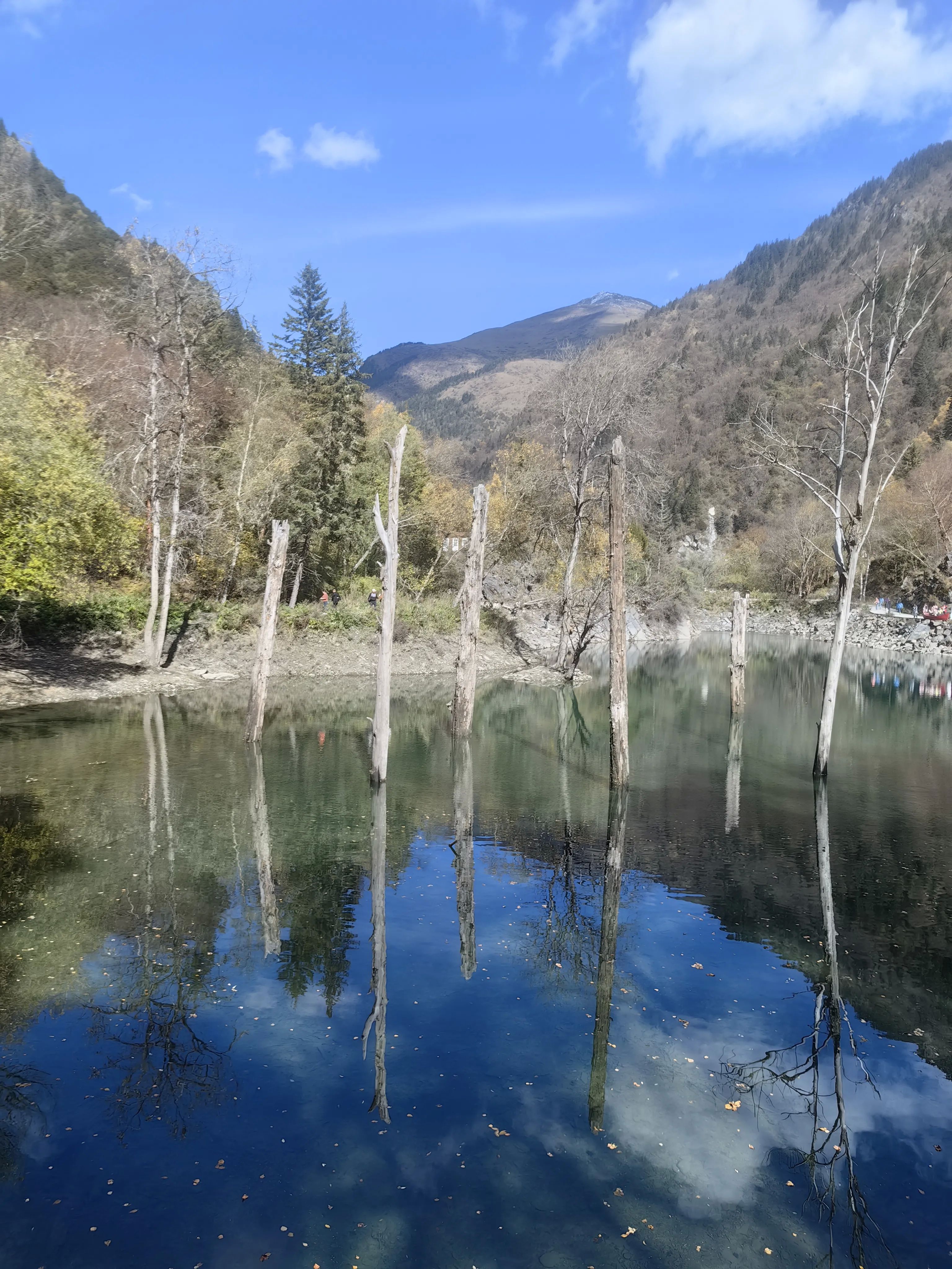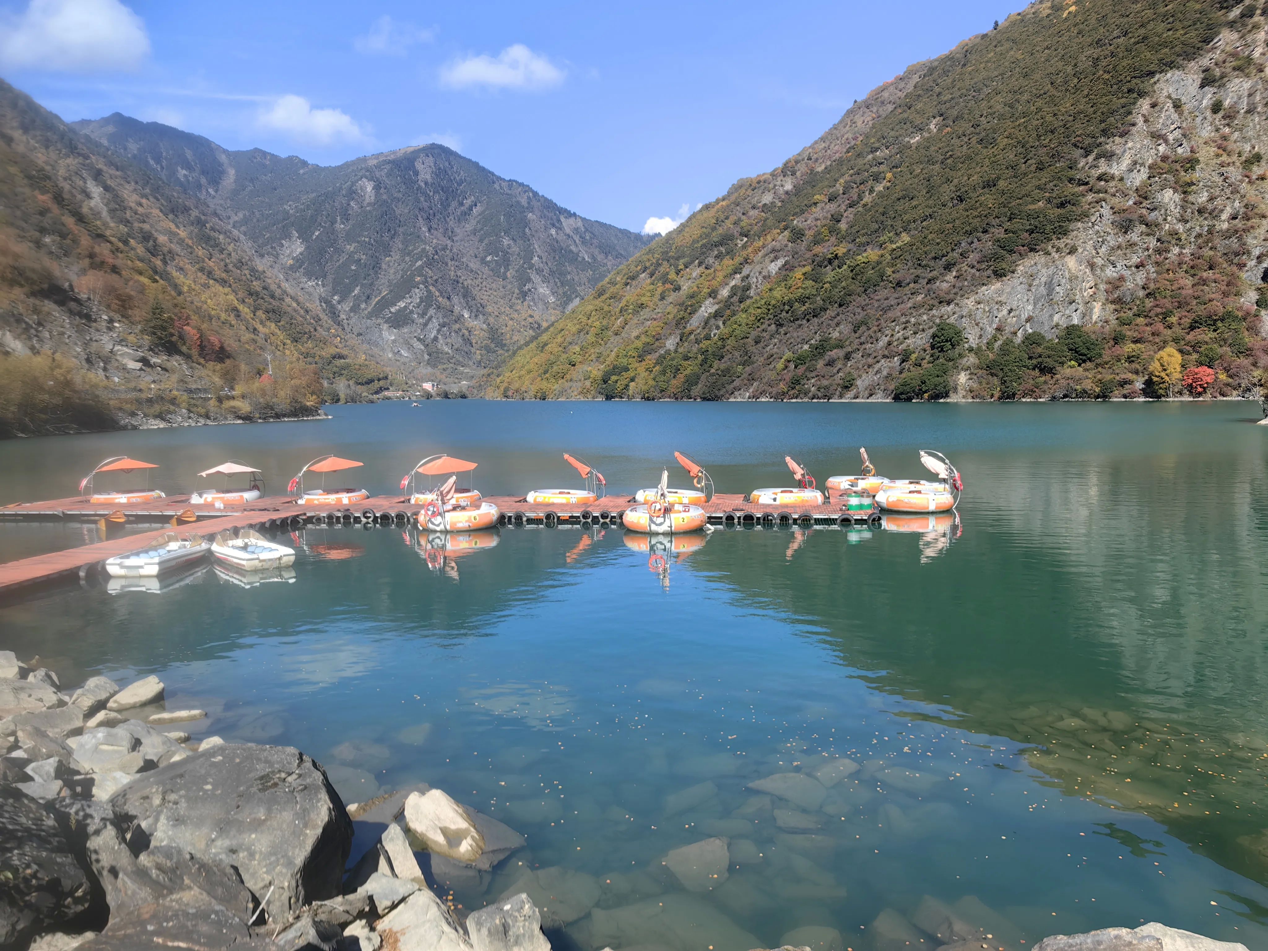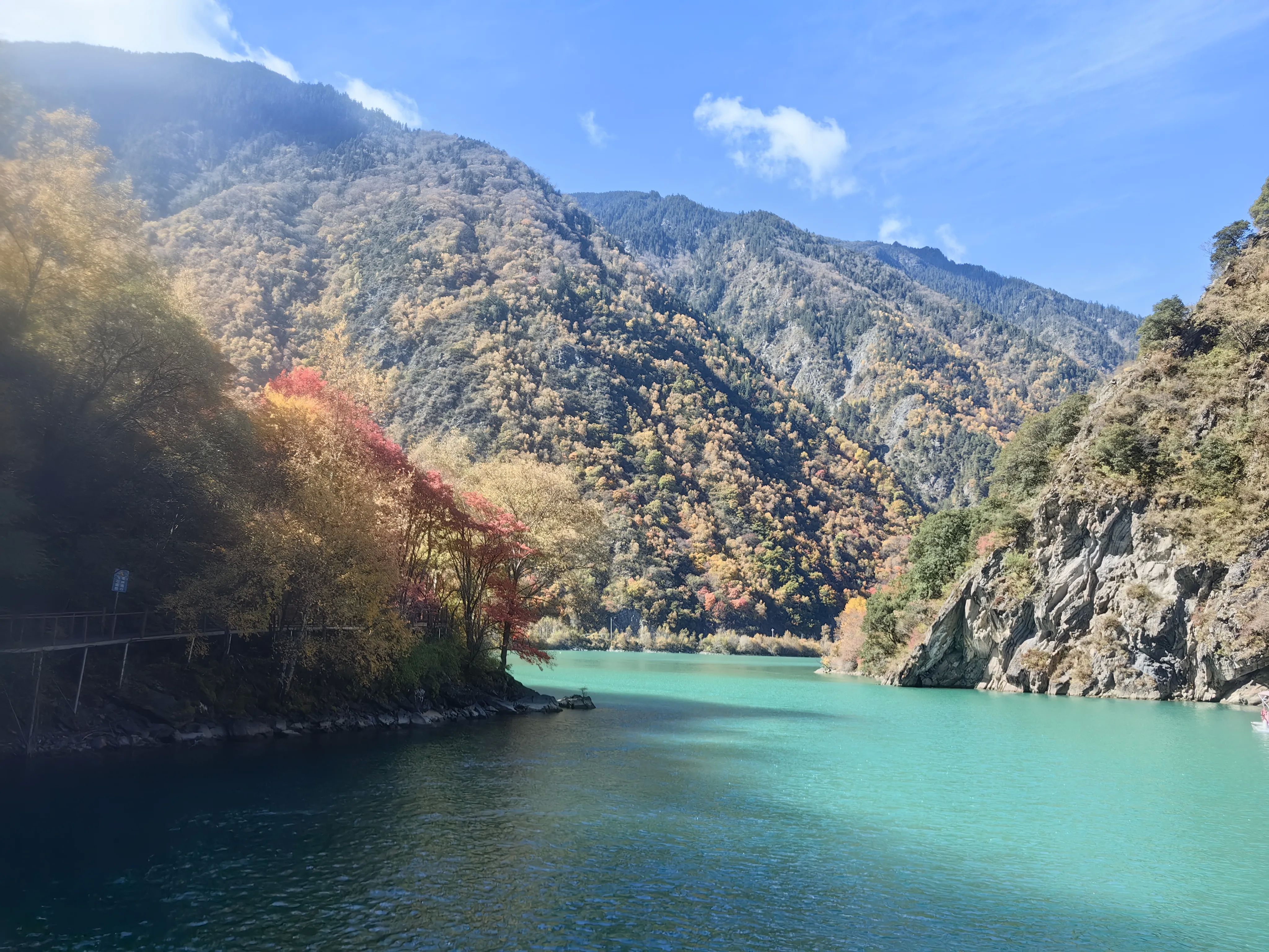3.景区门口扫码购票,成人票69 元/人,1分钟进入景区。进入景区后可以选择徒步,也可以选择坐景区观光车,观光车单程50,往返70/人。我们选择步行上,观光车下,事实证明这个选择是正确的。慢慢步行向上沿途拍照、蓝天、绿水、蓝水、红叶,颜色简直的绚烂多彩。沿着栈道前行,可以静心欣赏沿途的美景、多彩的海子,累了坐路边休整休整。全程步行大概3小时、海拔提升约600米,最顶端差不多3000米多一点。我们小队有70岁老人,5岁小孩,全程上山没压力。