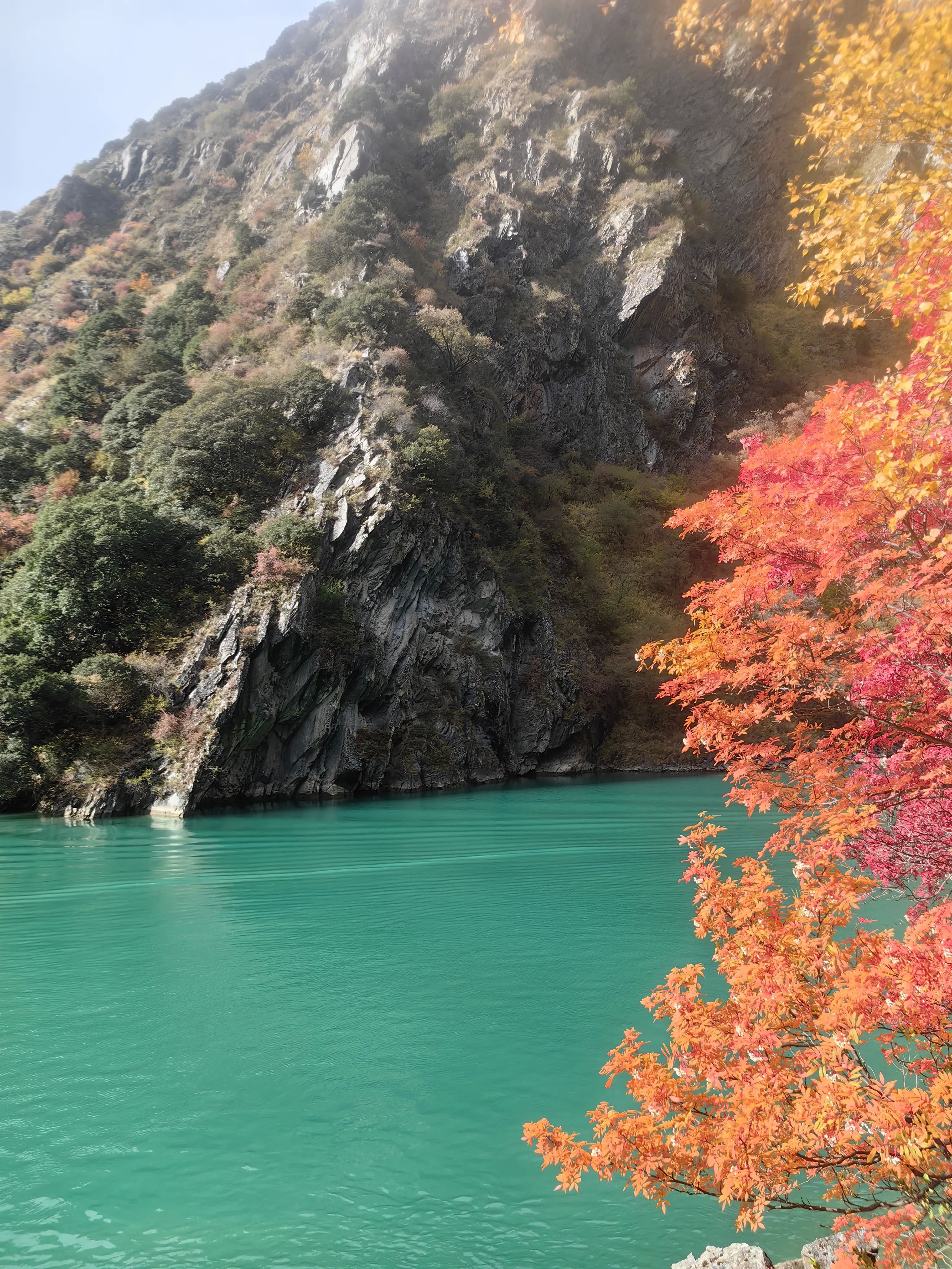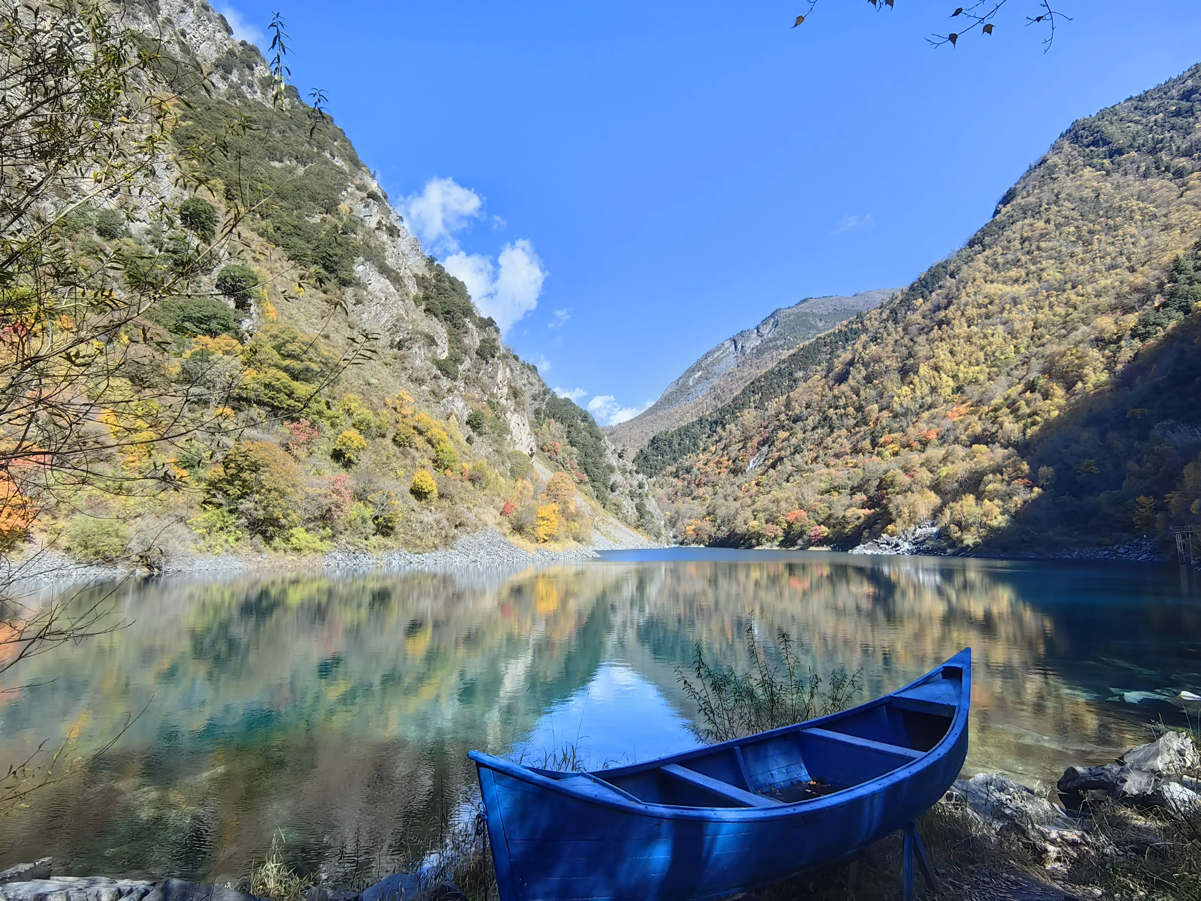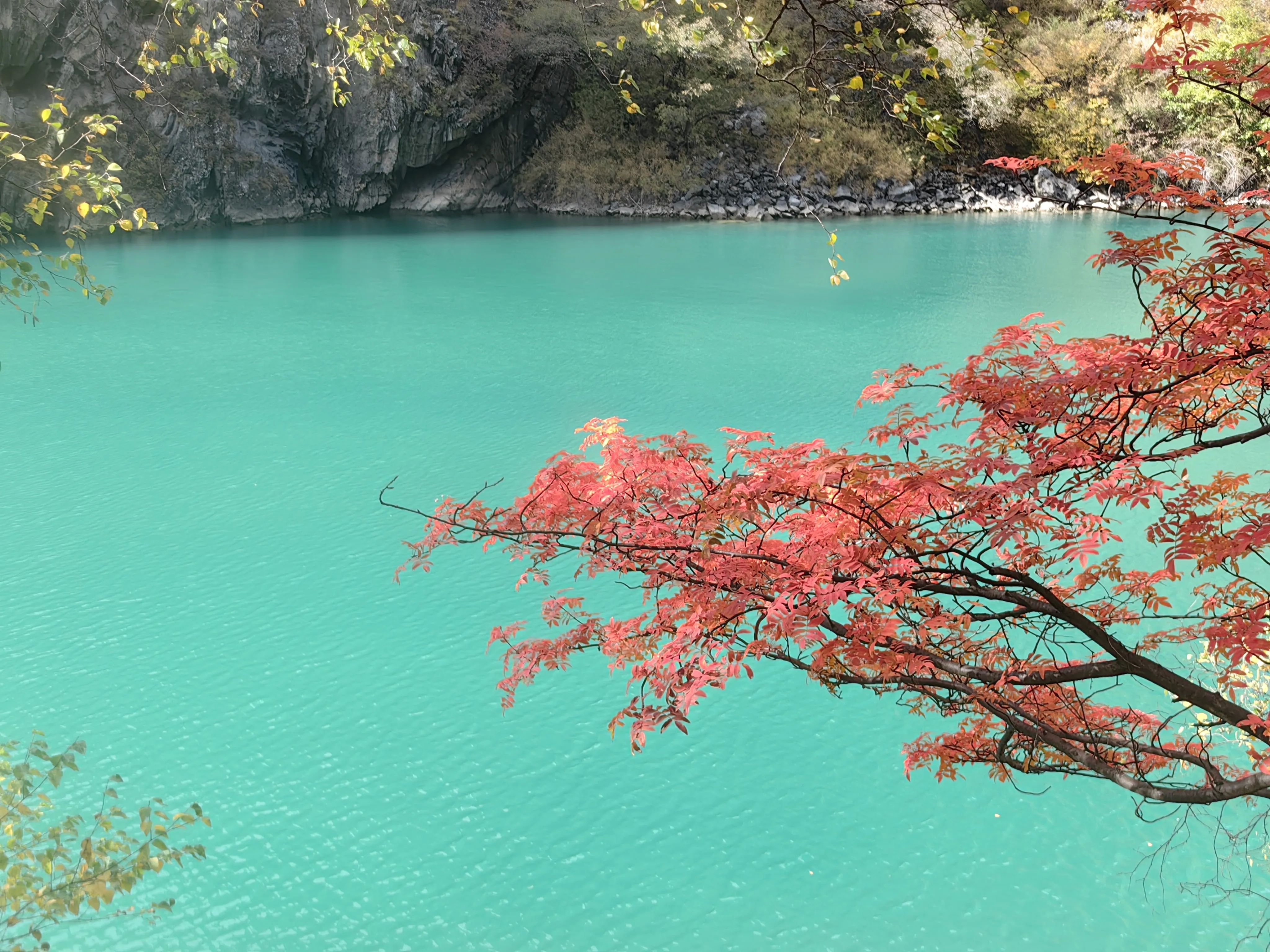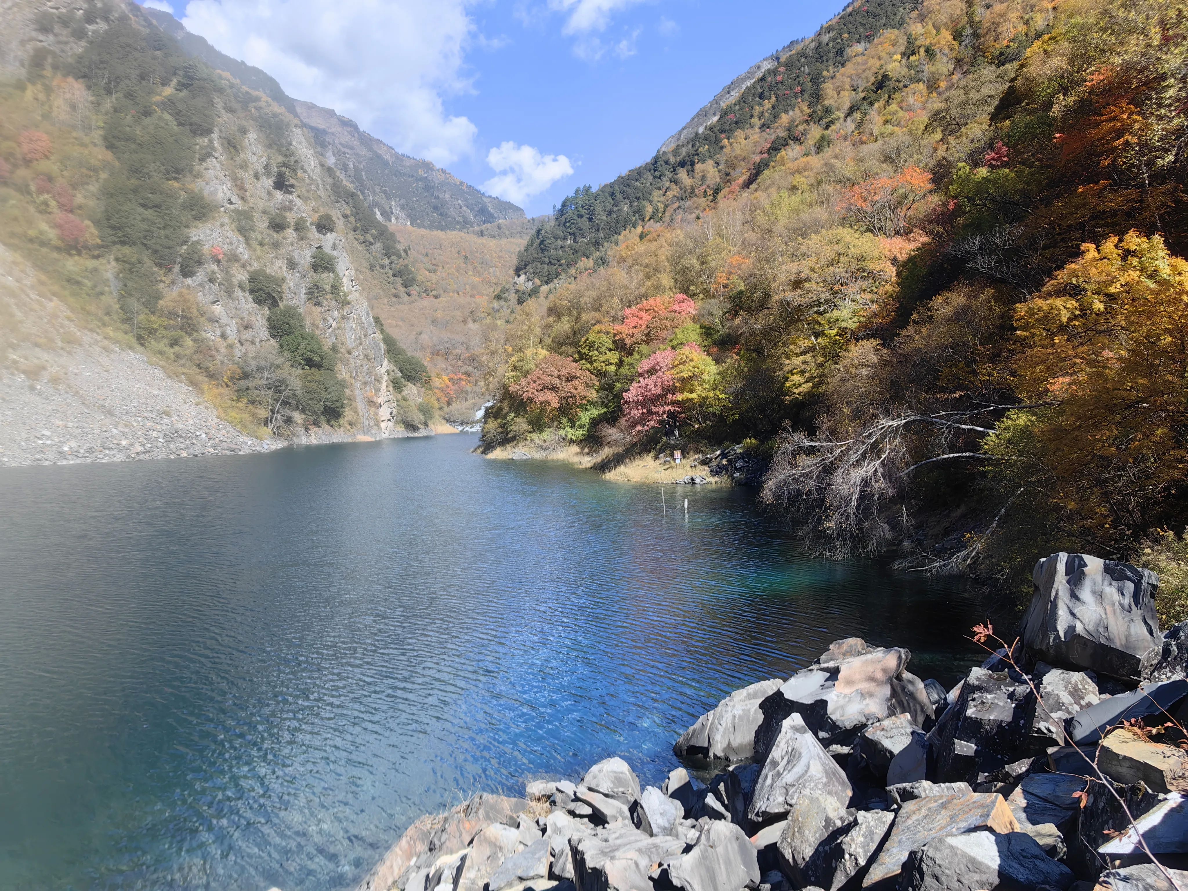 3.景区门口扫码购票,成人票69 元/人,1分钟进入景区。进入景区后可以选择徒步,也可以选择坐景区观光车,观光车单程50,往返70/人。我们选择步行上,观光车下,事实证明这个选择是正确的。慢慢步行向上沿途拍照、蓝天、绿水、蓝水、红叶,颜色简直的绚烂多彩。沿着栈道前行,可以静心欣赏沿途的美景、多彩的海子,累了坐路边休整休整。全程步行大概3小时、海拔提升约600米,最顶端差不多3000米多一点。我们小队有70岁老人,5岁小孩,全程上山没压力。