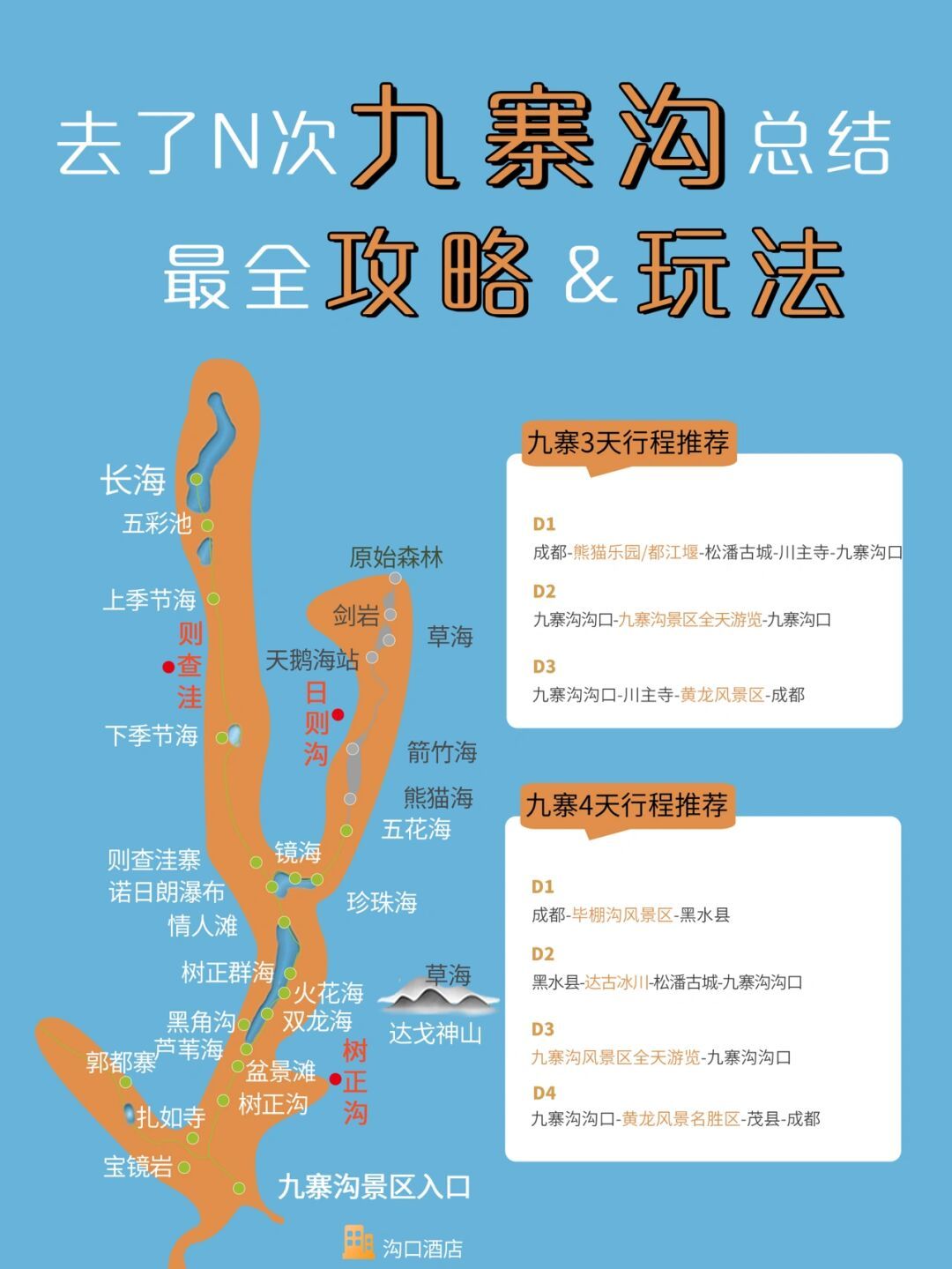 一般来说,走九寨沟3天时间足够,4天轻松玩。并且根据春夏秋冬不同,推荐搭配的景点也不同,冬春时节推荐走九寨+黄龙+毕棚沟+达古冰川(玩雪);夏季推荐九寨+黄龙+若尔盖大草原;秋季九寨+黄龙+达古/牟泥沟/松坪沟都行,都是看彩林的好去处。