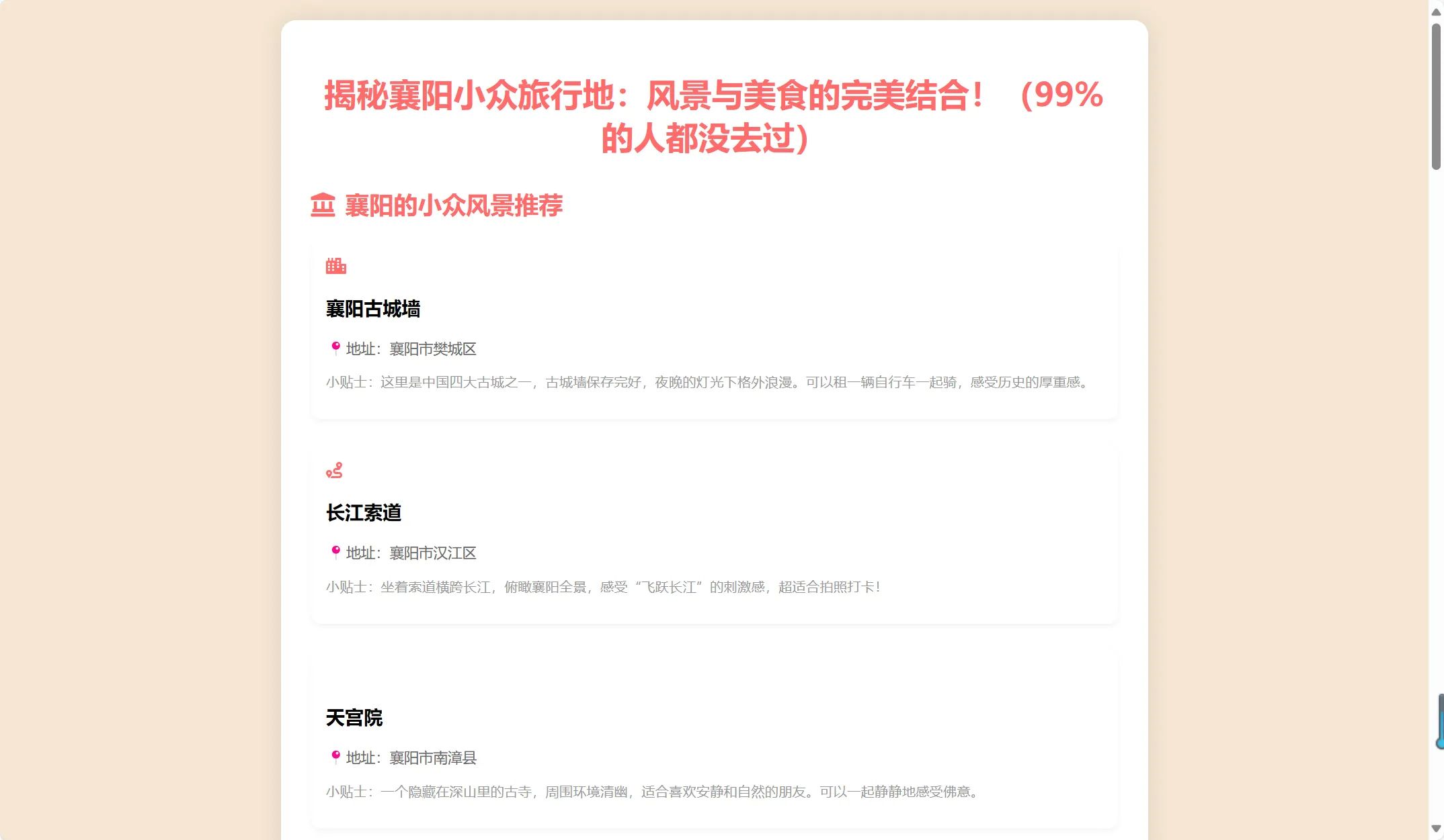 襄阳是一个充满历史和文化气息的城市,既有自然风光,也有地道美食,特别适合喜欢探险和品尝美食的情侣。希望大家能通过这篇攻略,发现襄阳的独特魅力!如果你有更多的旅行灵感或美食推荐,欢迎在评论区分享哦!