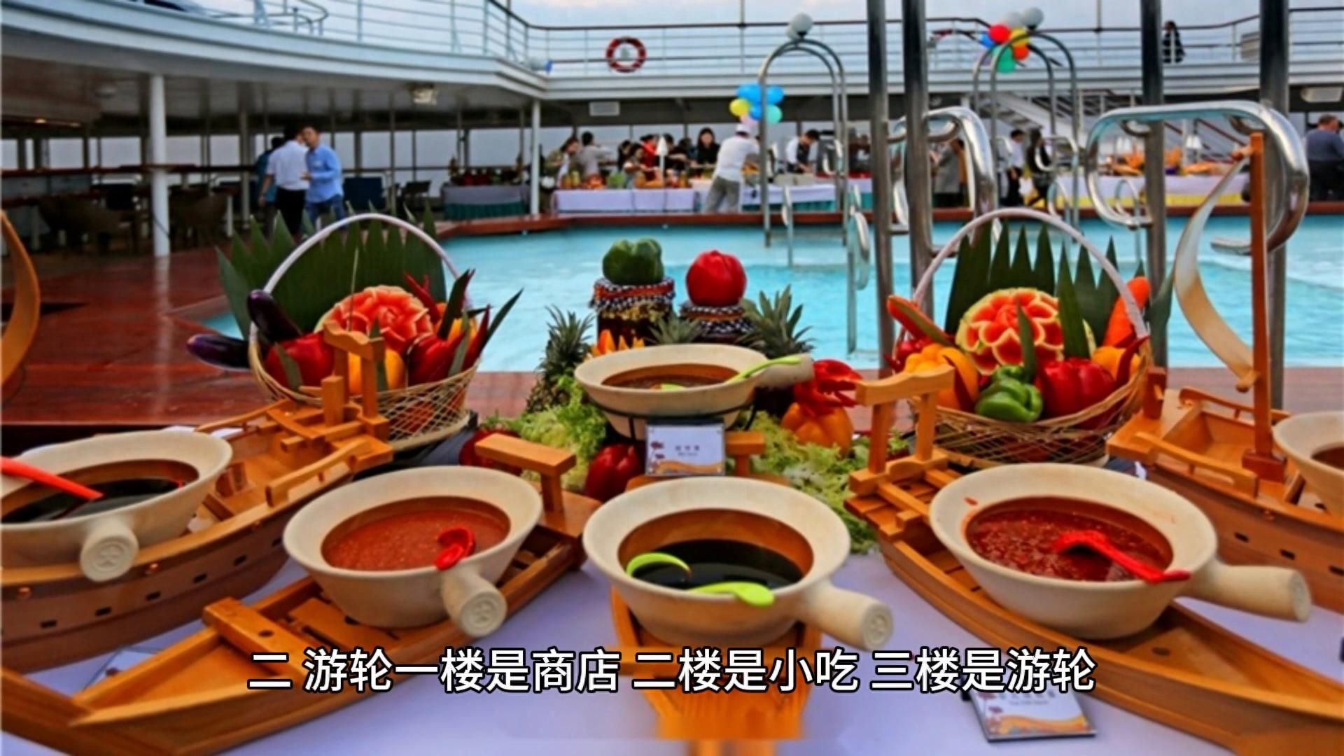 2. 游轮的情况,一楼是商店,二楼是小吃,三楼是游轮。