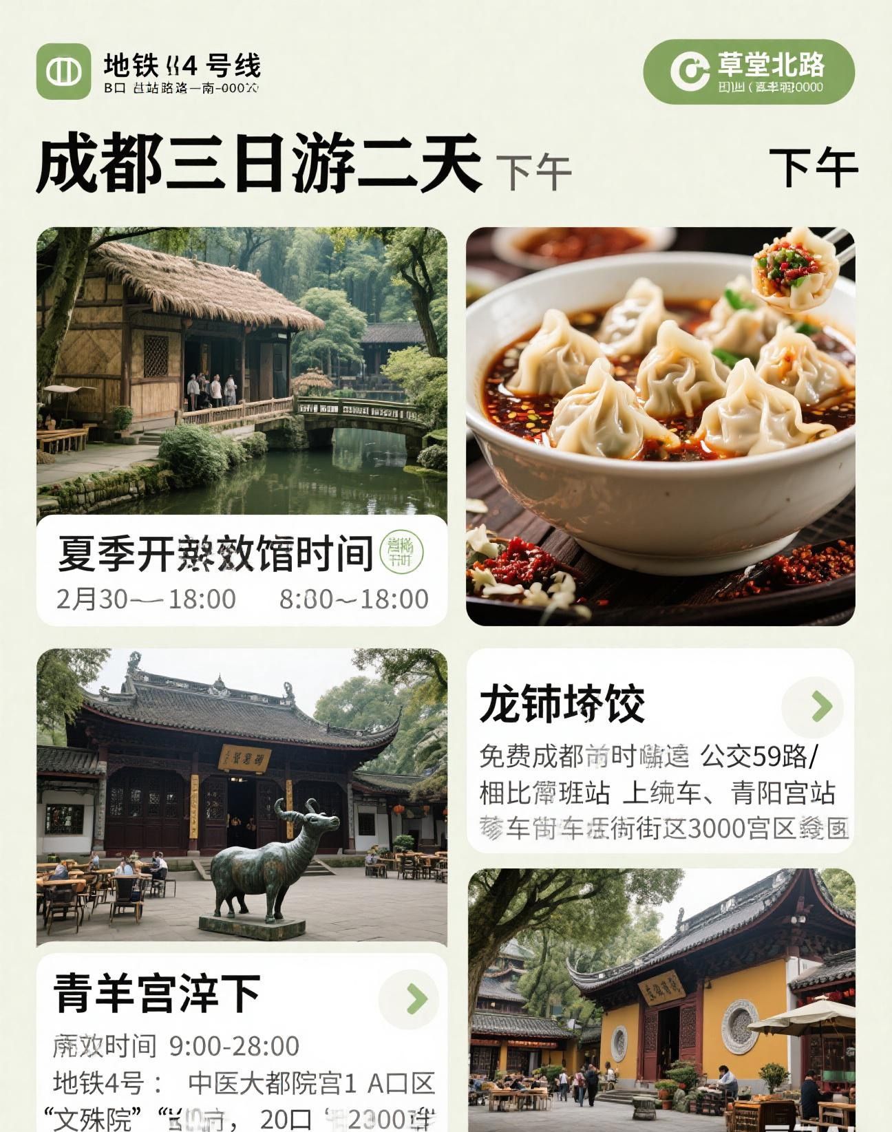 • 下午:前往青羊宫,参观主殿三清殿和镇馆之宝铜铸青羊,还可在院子后面的茶馆品茶,感受成都的慢生活。开放时间 8:00 - 18:00 。从杜甫草堂乘坐公交 59 路,杜甫草堂站上车,青羊宫站下车,步行 100 多米即到。之后前往文殊院,这座千年古刹能让人暂时忘却喧嚣。免费开放时间 9:00 - 17:00 。从青羊宫乘坐地铁 4 号线,中医大省医院站 A 口进,骡马市换乘 1 号线到“文殊院”站,K 出口,出站步行 200 米。在文殊院周边,一定要尝尝宫廷糕点,桃酥、拿破仑、绿豆糕等种类繁多,口感细腻,甜而不腻,常常需要排队购买。