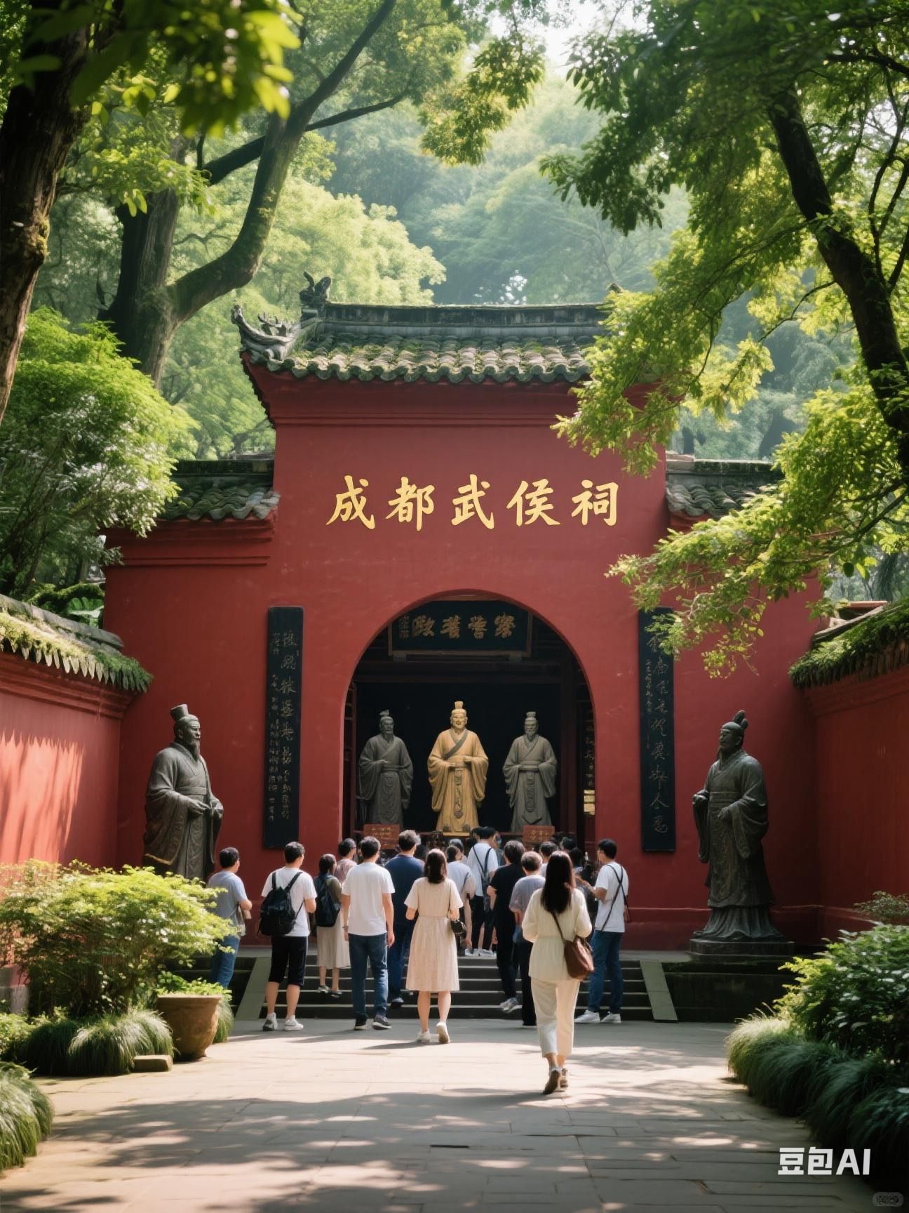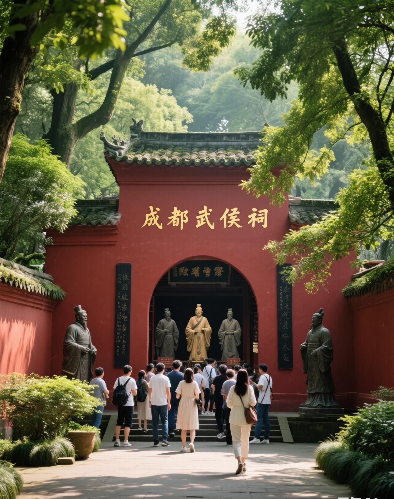 • 上午:前往武侯祠,这里是纪念诸葛亮的专祠,也是中国唯一的君臣合祀祠庙,能让您深入感受浓厚的三国文化,打卡标志性的“红墙竹影”。开放时间 8:00 - 18:00 ,乘坐地铁 3 号线“高升桥”站 D 出口出站,沿武侯祠大街向东北方向步行约 500 米即到。