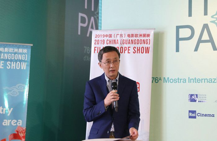 9月3日,由广东省委宣传部和广东省电影局等机构主办的广东电影欧洲展映活动,在威尼斯电影节的意大利馆揭幕。图为意大利国家电影音像和多媒体工业协会国际部主任罗伯托·斯塔比莱在活动上致辞。(新华社记者程婷婷摄)
