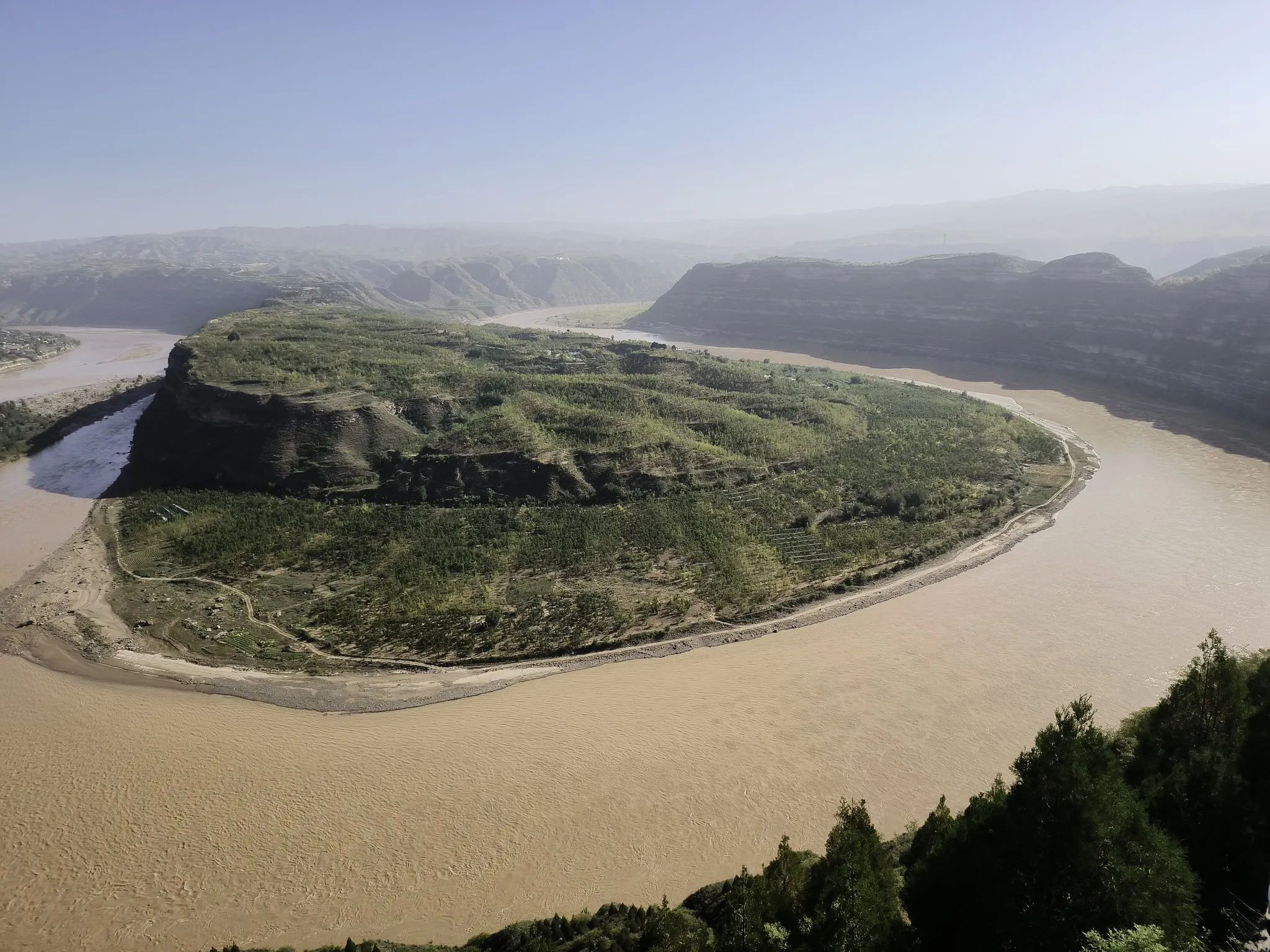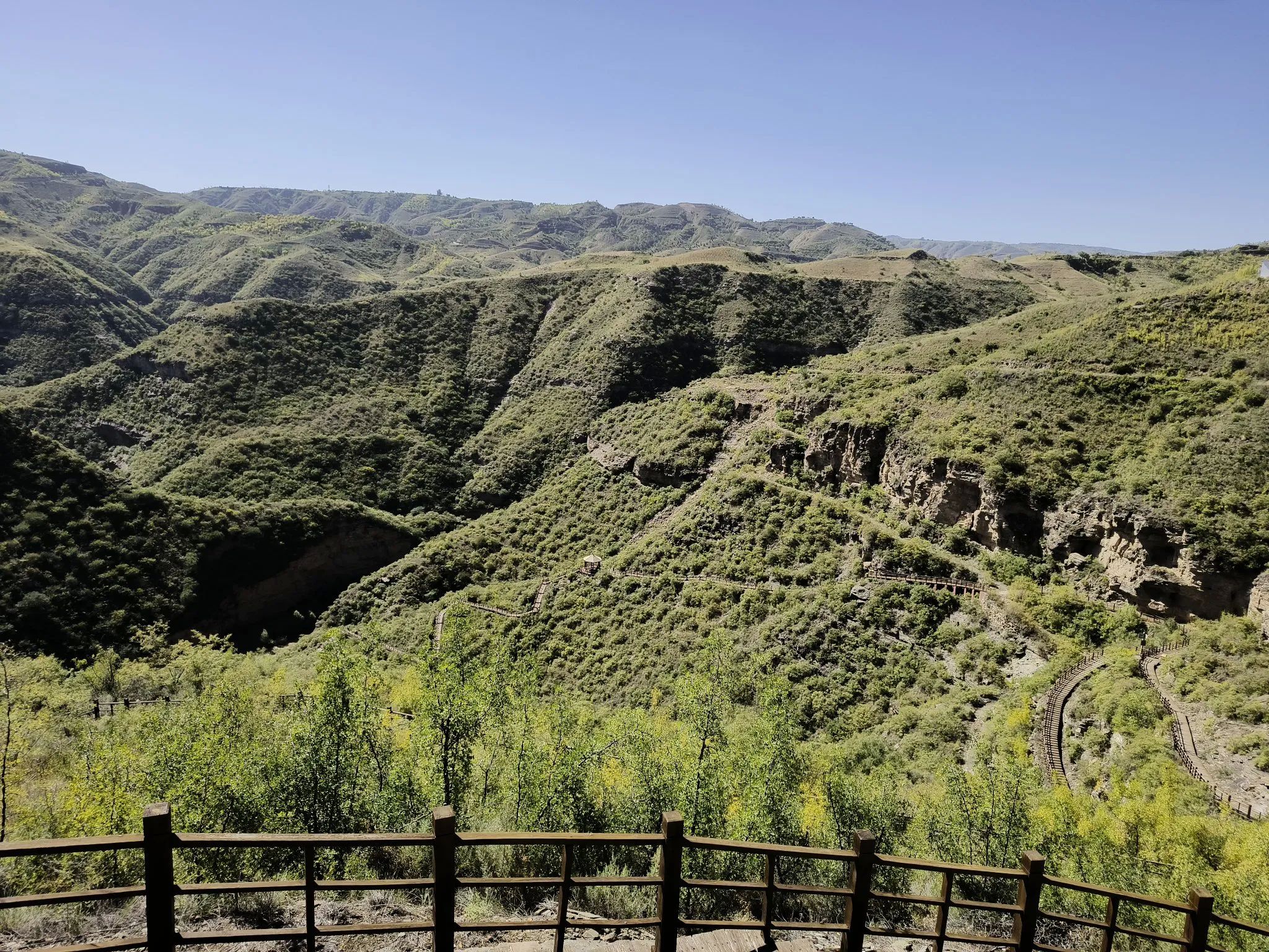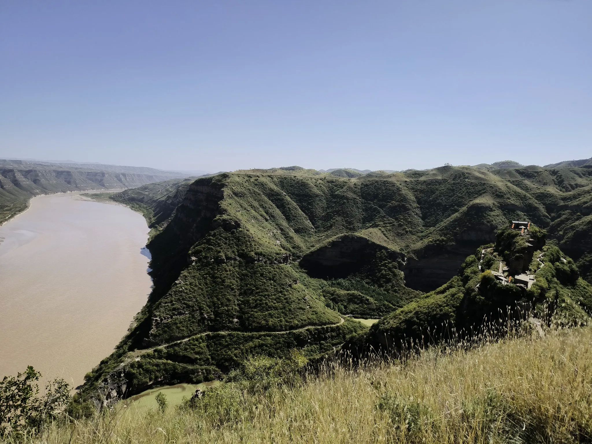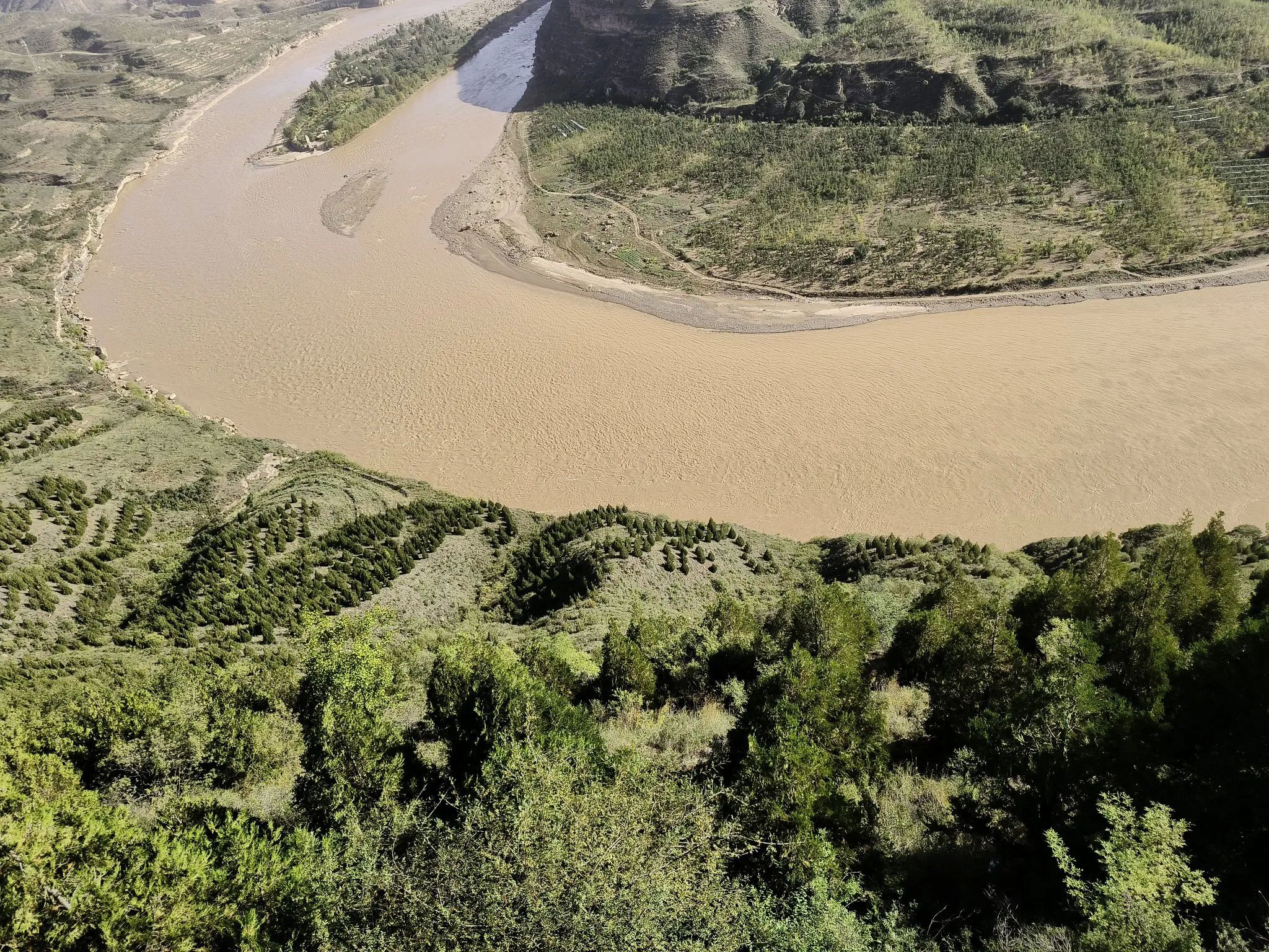 进入景区有三个观景台,从不同的角度观看景色不同。第一观景台看乾坤湾全貌呈U形,河面没有清水湾宽,从裸露的部分河床和河面波纹来看水不太深,水依旧是土黄色,河水环绕的对面山体没有清水湾高大,景色稍逊清水湾;从第二观景台看,呈S形;从第三观景台看群山重连叠嶂,感到黄河从万千阻隔中奔流入海真不容易!可能是黄河水和湿气的滋润,黄河两岸植被良好,人工造林成效显著。高空和无人机拍摄可见黄河全景,黄河流淌在绿色的千山万壑之中巍巍壮美!