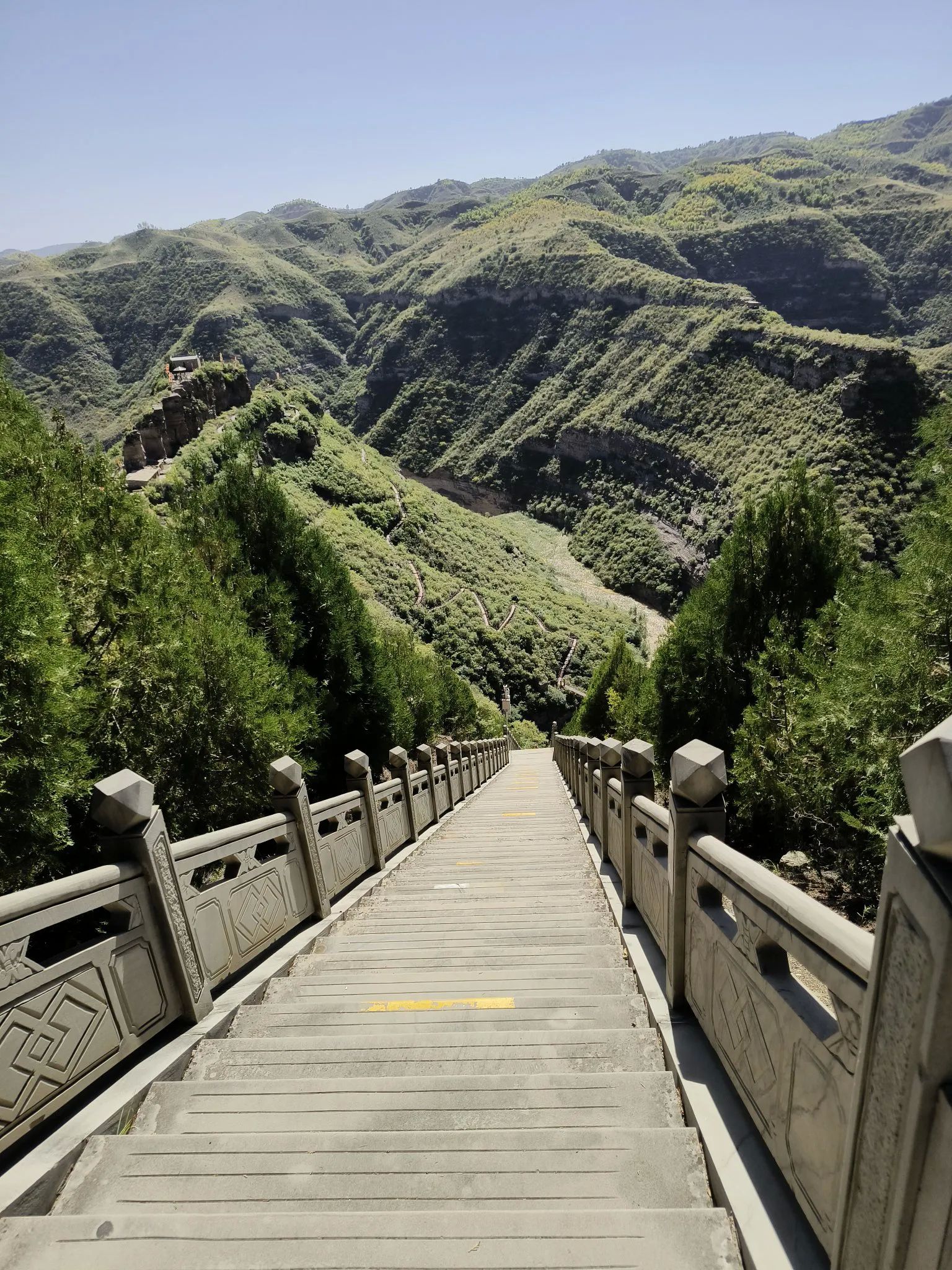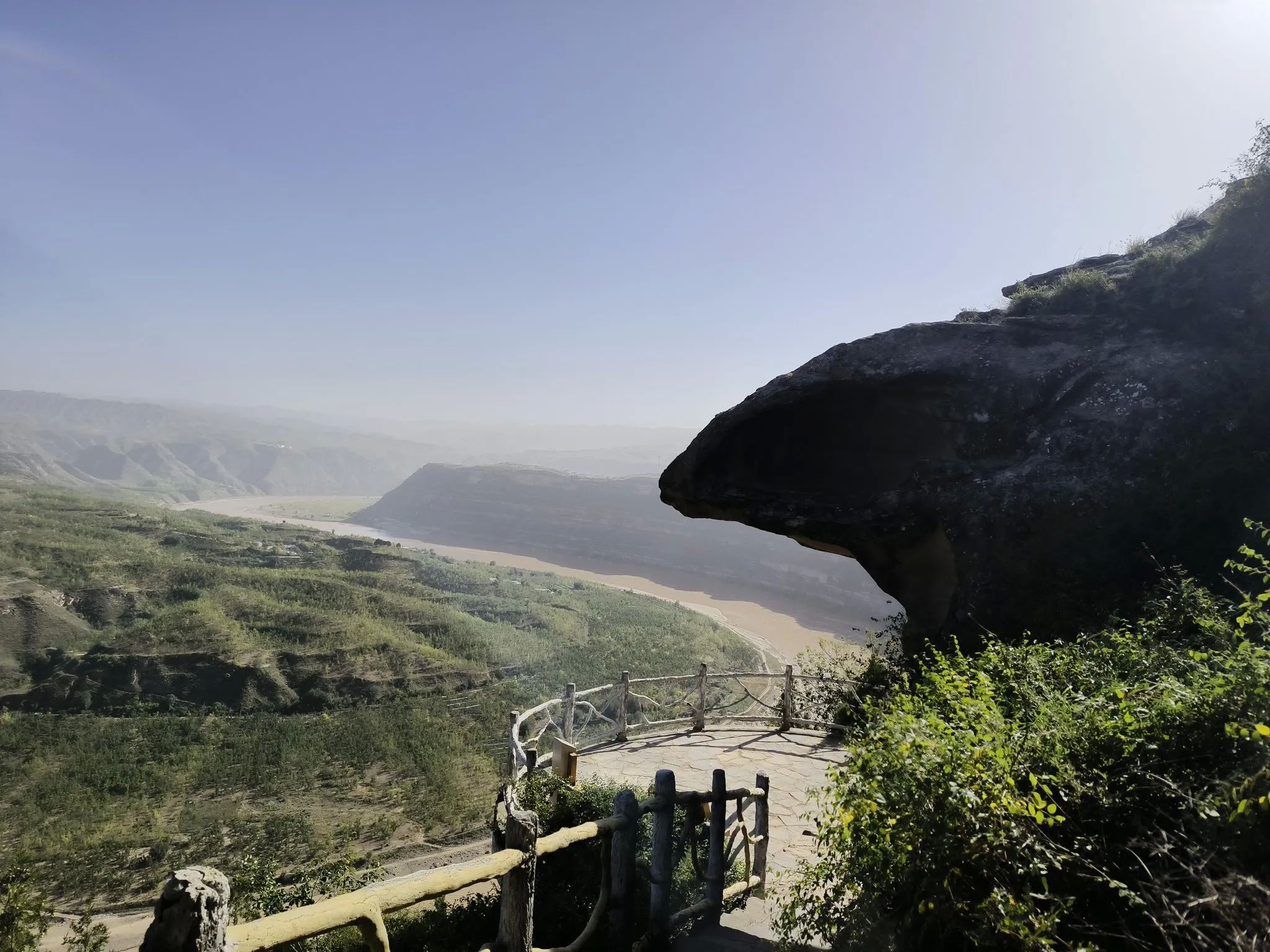 游完乾坤湾,我们驱车来到它的下游对岸黄河栈道景点,领了安全帽从栈道往下俯瞰,200米深的山下就是黄河,恐高的人还真不敢下。我要重点介绍的是这里的栈道,是在崖壁凿洞,楔入水泥横梁和立柱,架设实木步道,铁栏杆和铁链防护,十分的坚固安全;最贴心的是木栈道是缓坡度设计,不是台阶,走起来舒适,不费膝盖,很适合中年人去体验。刚进去右边是相传伏羲母族居住的石洞,有两米多高,大小洞有十几个;崖壁和洞顶的刻画以及洞里的塑像形象地展现了远古时期人们打猎、劳作和生活的场景。那时的人以血缘关系聚居,属母系氏族社会,使用打制石器,以动物为食,穿的是用骨针缝制的动物毛皮。游客要注意就是山体落石,由于亿万年来风化和地壳运动的挤压,暴露的山体松动和裂开的石块时有脱落,成为安全隐患。从栈道下到河底就是黄河码头,有游船可以摆渡;河滩地上种有枣树和红薯,是黄河的特有品种。从底下仰视兴叹:上去难!怕石头掉落,还是坐车走大路上吧。