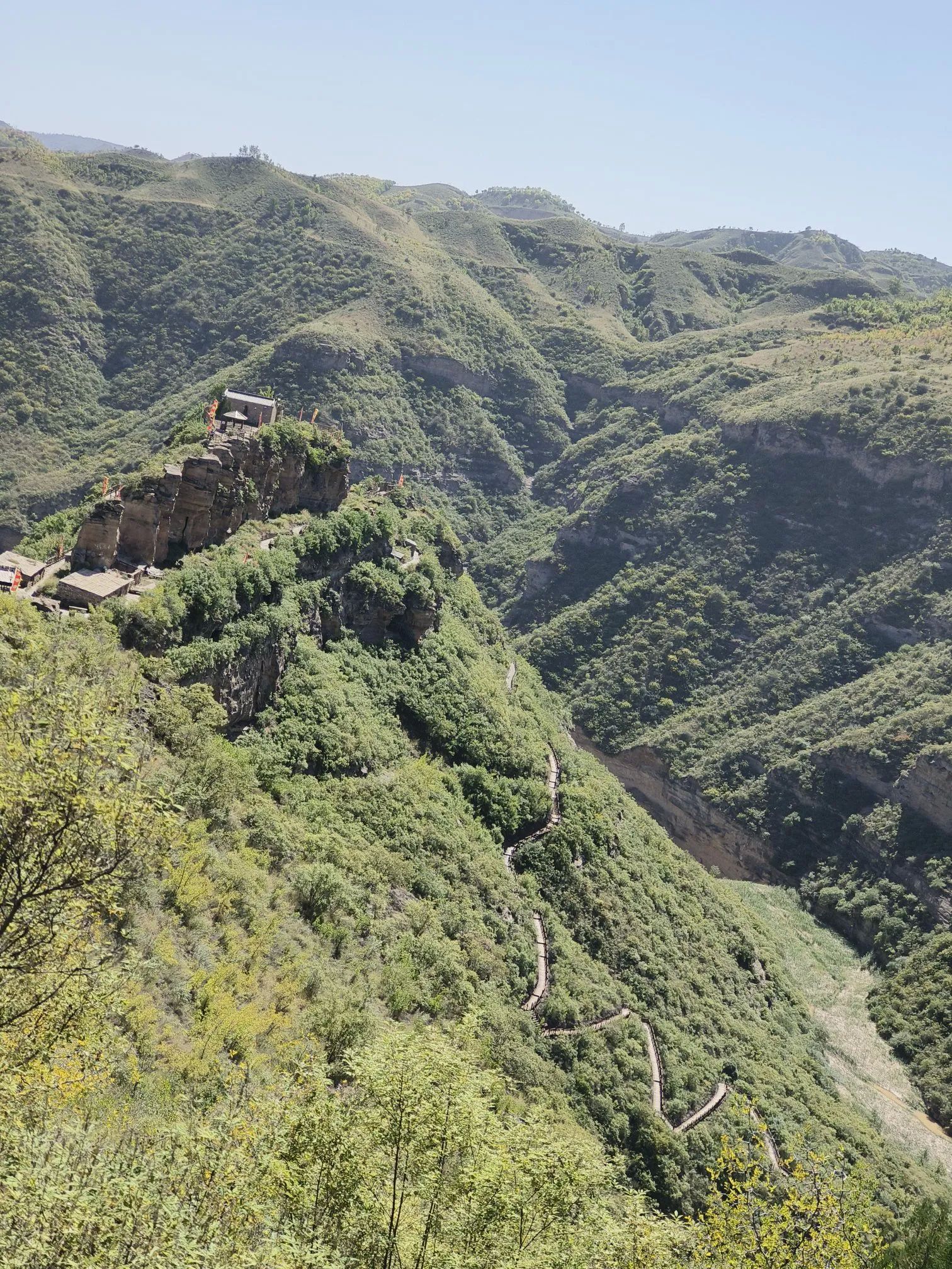 不知不觉已经中午十二点多了,由于搞不清楚各景点具体方位,我们决定直接导航下一个景区——吴堡石城,决定沿途经过那个游览那个,碰巧我们经过了会峰寨、牛尾寨。牛尾寨景点无人,上去台阶多,罢了!往前拐进去五公里去了会峰寨,这里就是前天游览的清水湾的对岸,索道的另一头。黄河在这里可以看到一个湾,黄河右边就是一汪清水和会峰寨。会峰寨地势险要,悬崖绝壁,易守难攻,是占山为王的好地方。俯瞰风景不错,木栈道曲里拐弯从山上延伸到会峰寨,再到黄河边,足有几公里长,游客知难而退,没有人敢下去。