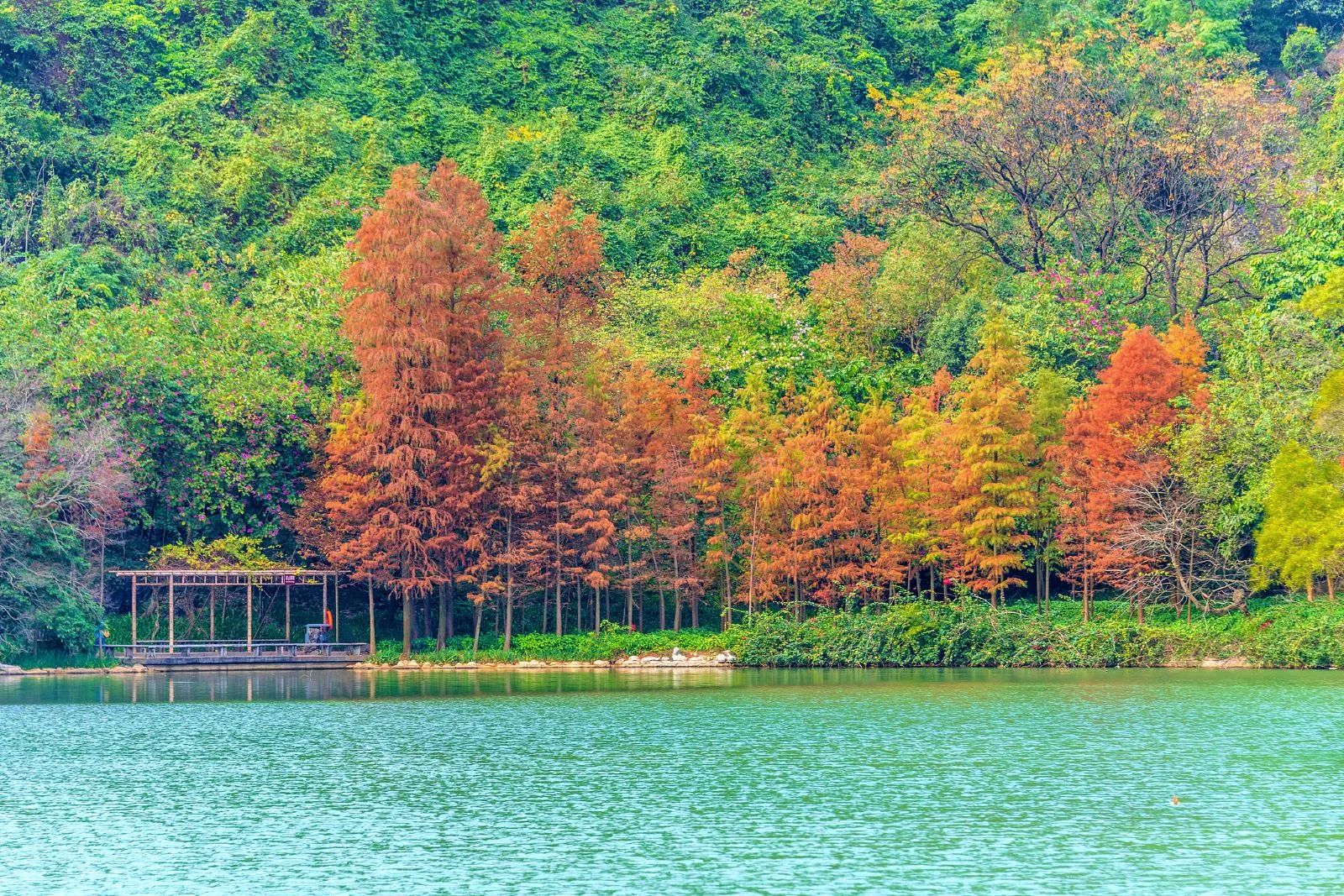 特色:喀斯特水上天坑,湖水会随着光线变化从孔雀蓝变成翡翠绿。