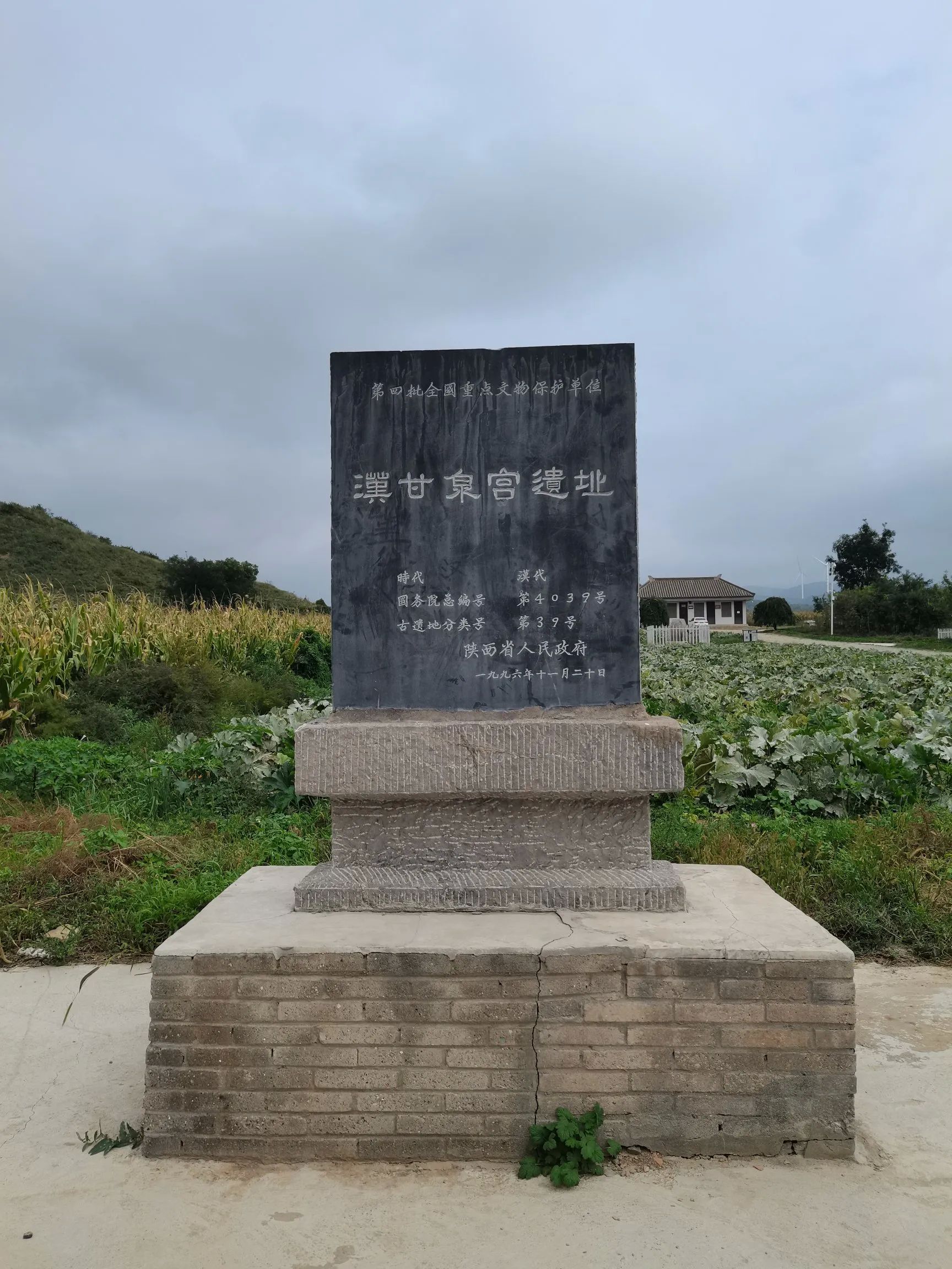 秦直道起点,位于淳化县城北铁王镇凉武帝村(原秦时军事要地云阳林光宫),是始皇帝统一六国后,为北击匈奴所修建的一条军事要道,向北直达今内蒙古包头市的九原郡,全长700余公里,也是世界公认最早的高速路雏形。一条村道从中穿过,将其分为东西两段,青砖漫地,西半部矗立“秦直道起点”高大石碑,右侧有几座碑刻,分别是“张骞出使西域”、“昭君出塞”、“蔡文姬归汉”、“汉武帝北征”等。沿着东侧直道直行到尽头,右侧有一小道,便可到达汉甘泉宫遗址。除有几处建筑遗迹展示外,都是村民种植的蔬菜庄稼,只有一座类似于管理处的三间房屋孤零零的矗立。