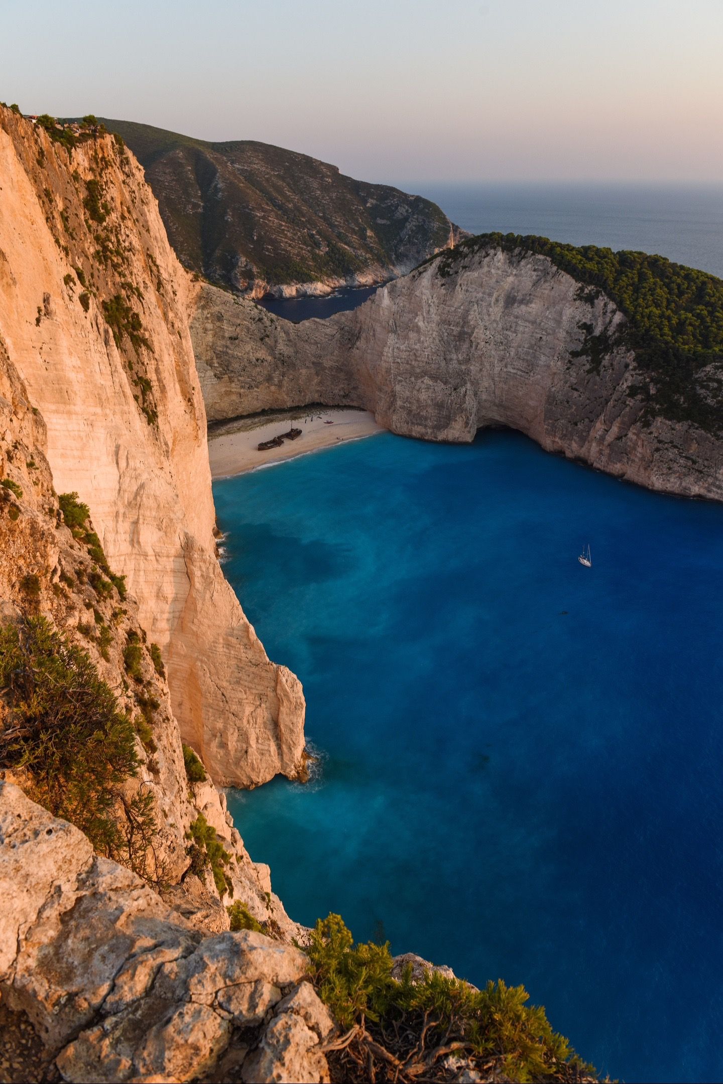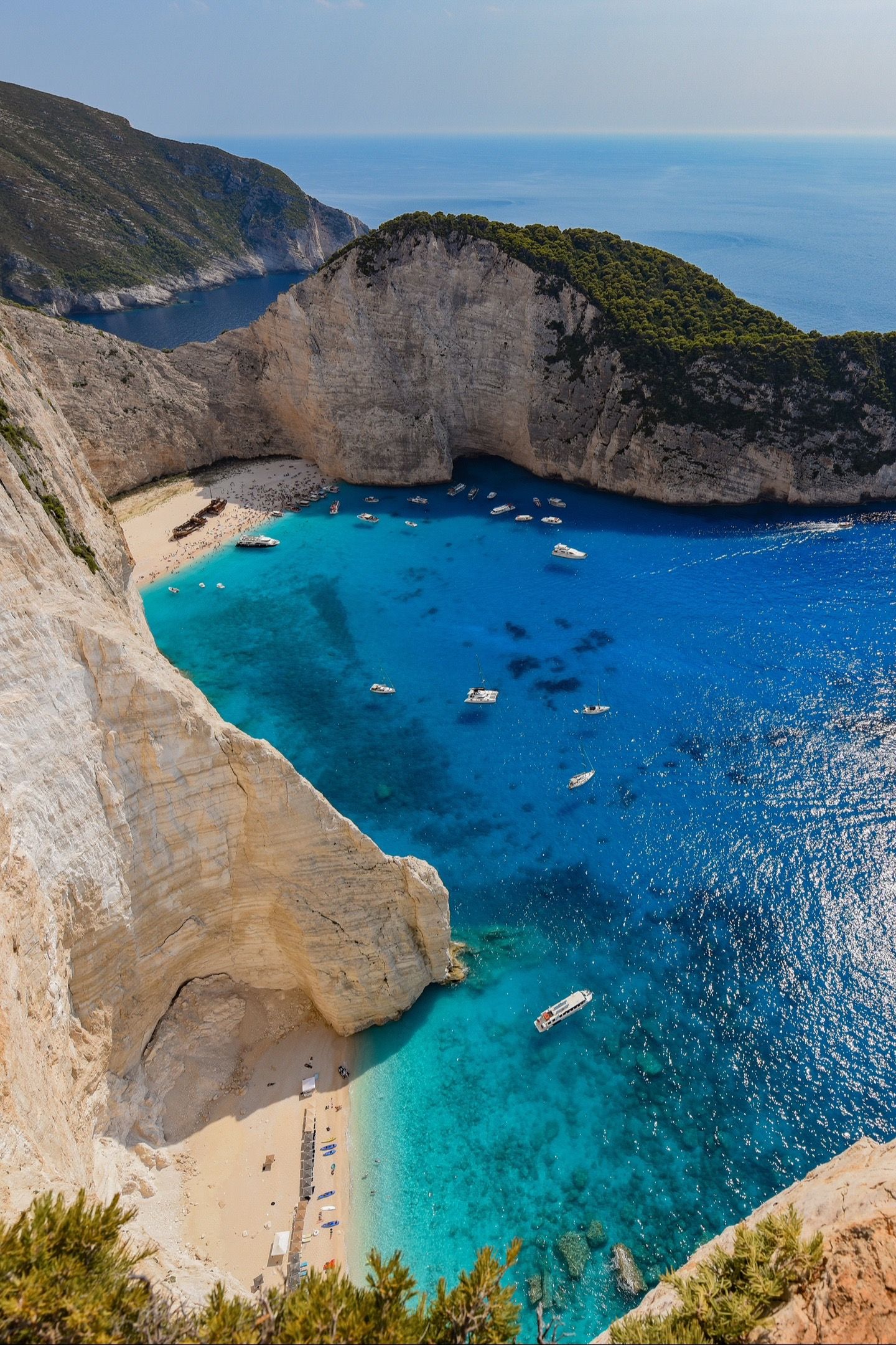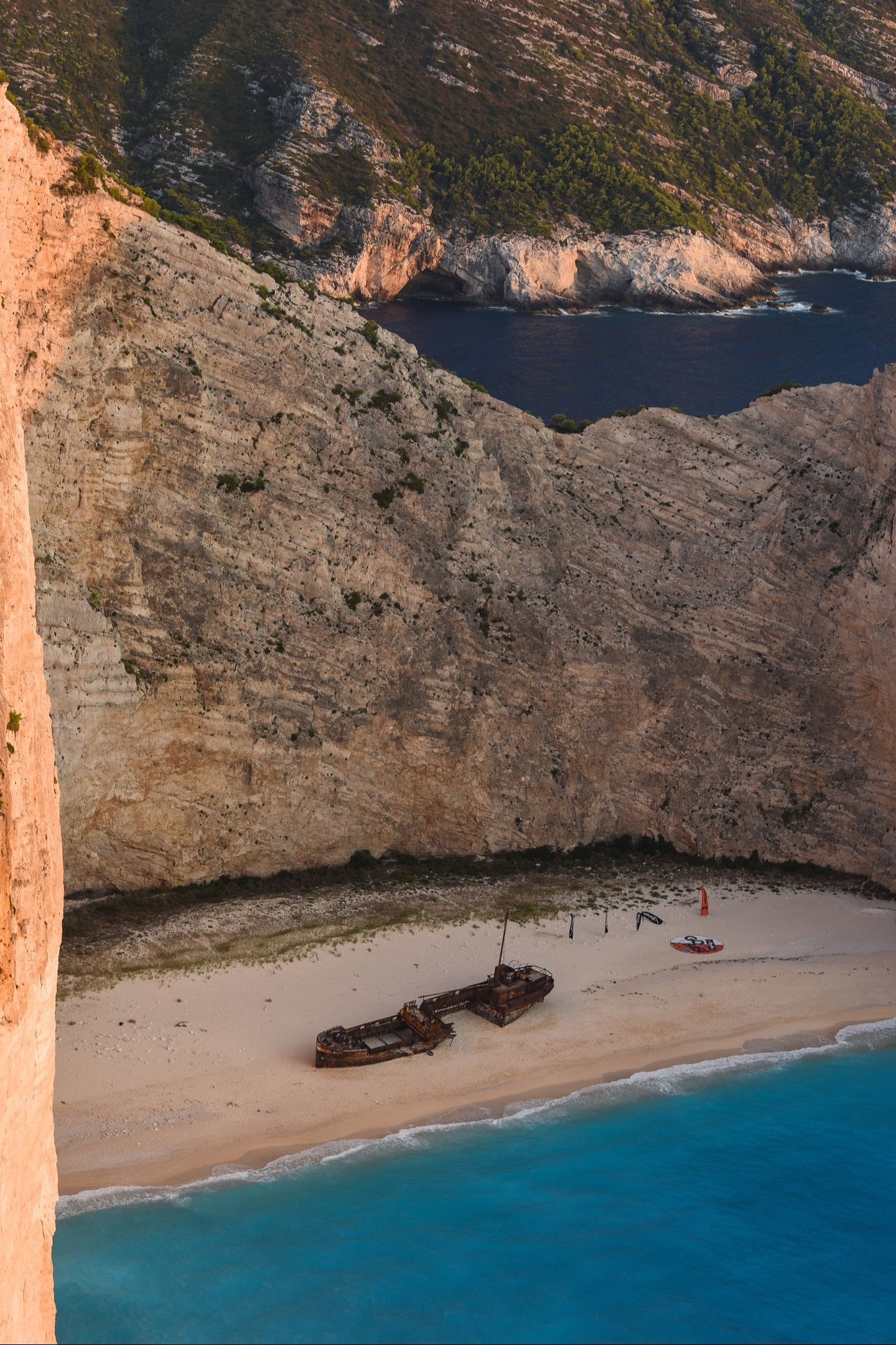 沉船湾的地理位置极为独特,仿若一位羞涩的少女,藏在扎金索斯岛西北部的悬崖底下。若想揭开她神秘的面纱,抵达这片神秘海域,只有一种途径,那便是从 10 多公里外的小镇码头乘船前往。而倘若要将沉船湾的美尽收眼底,悬崖顶上无疑是最佳观赏点。