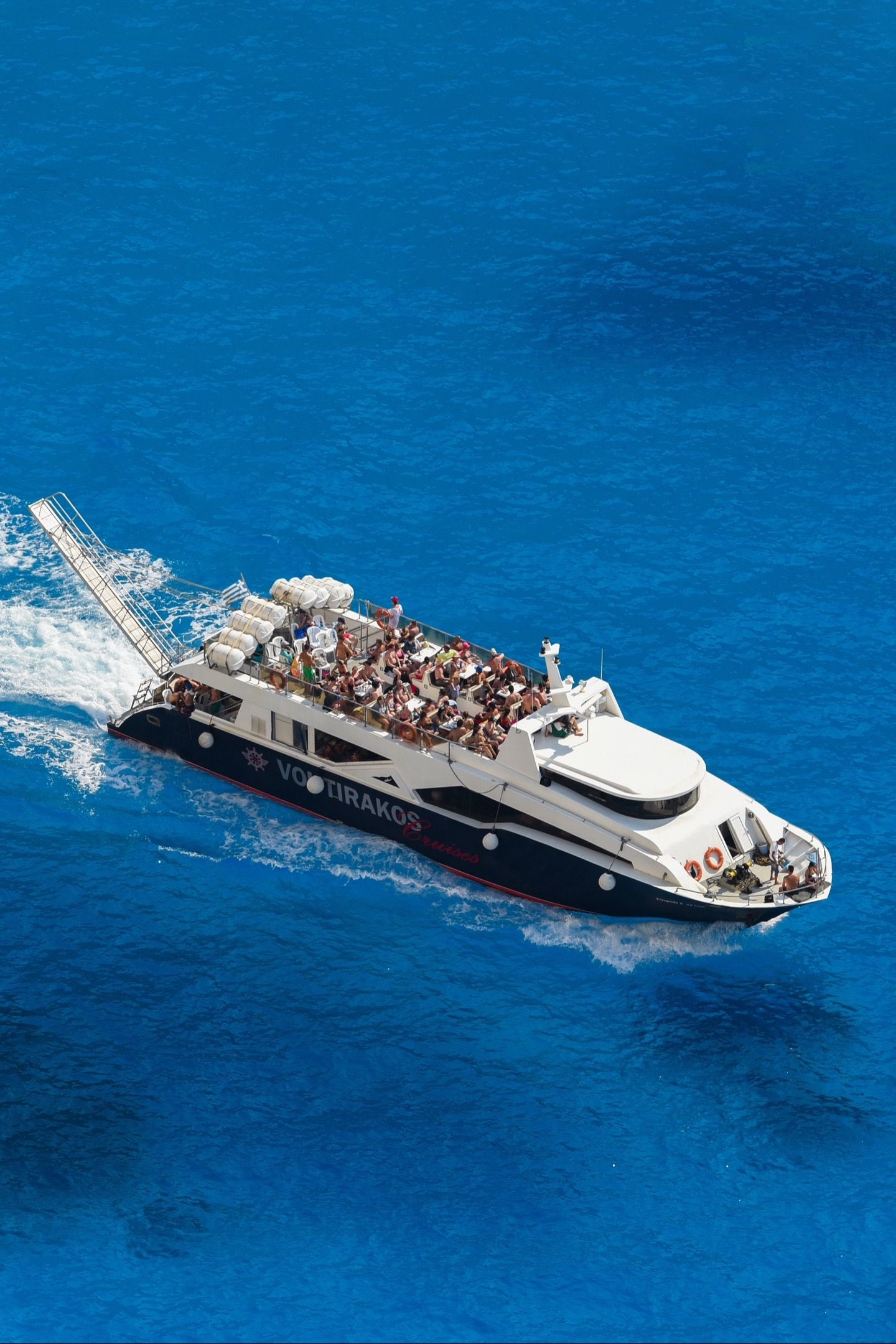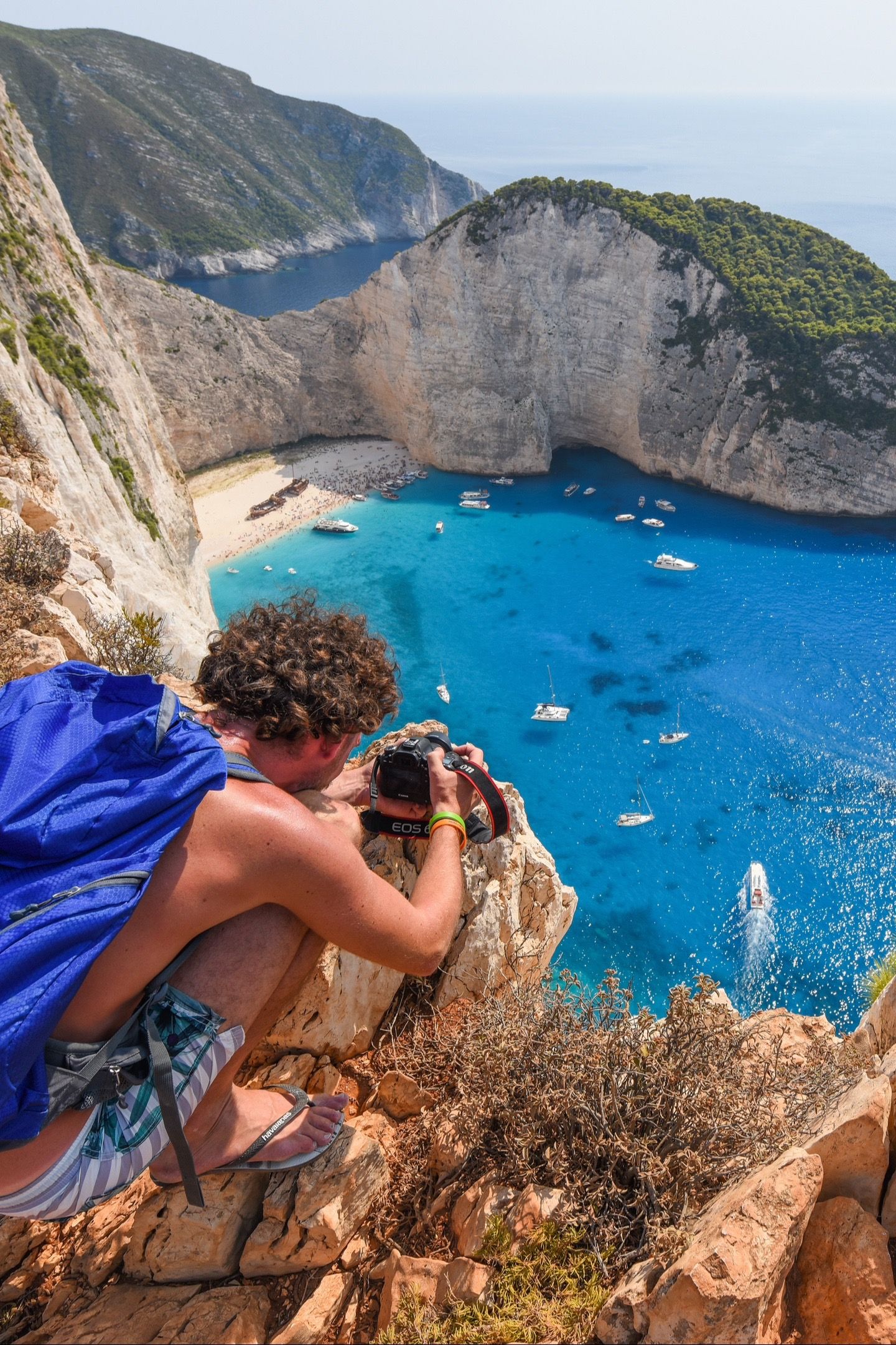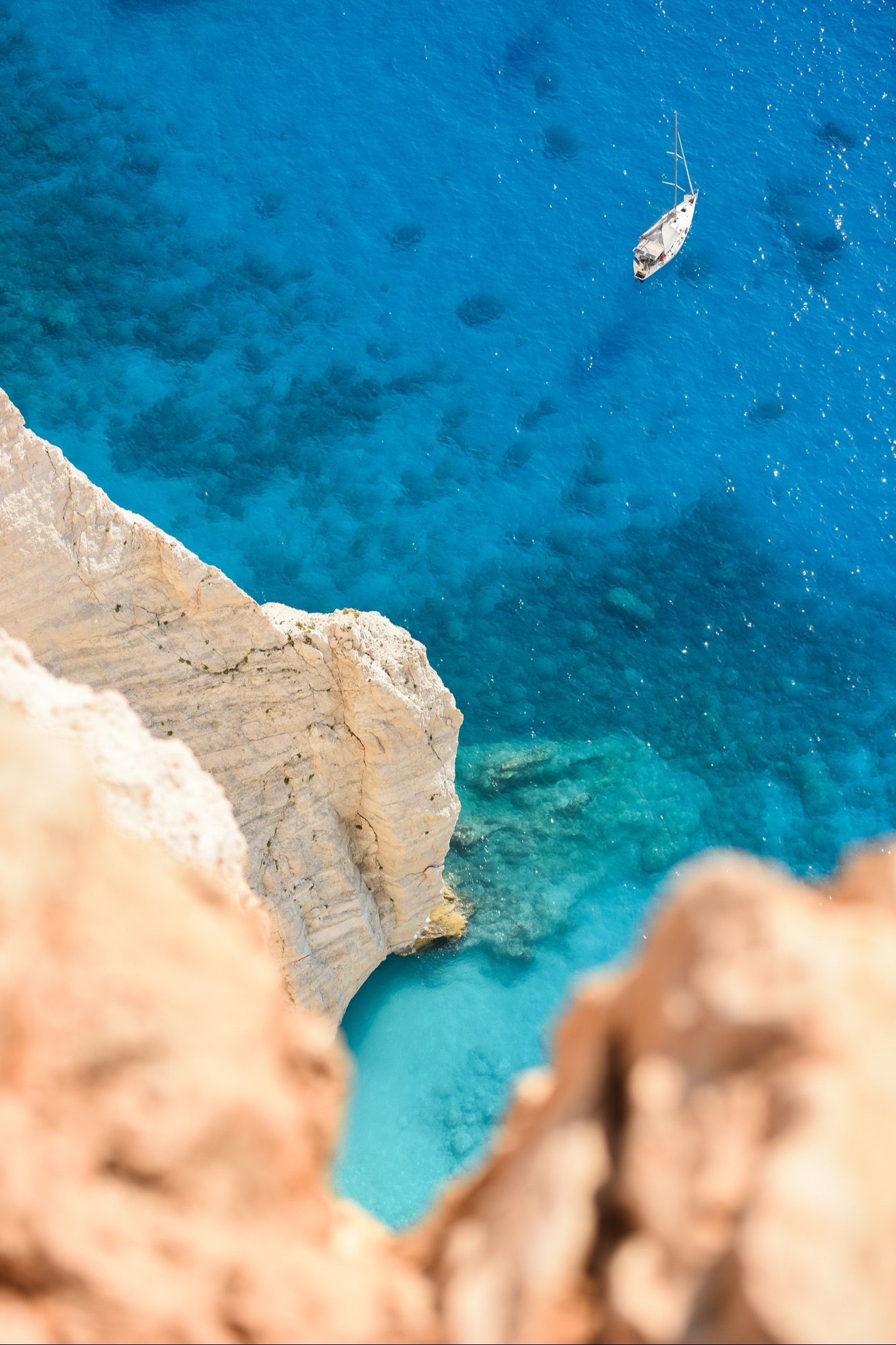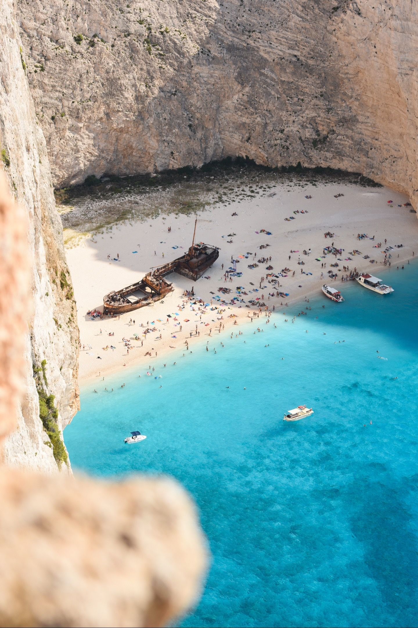 沉船湾的地理位置极为独特,仿若一位羞涩的少女,藏在扎金索斯岛西北部的悬崖底下。若想揭开她神秘的面纱,抵达这片神秘海域,只有一种途径,那便是从 10 多公里外的小镇码头乘船前往。而倘若要将沉船湾的美尽收眼底,悬崖顶上无疑是最佳观赏点。