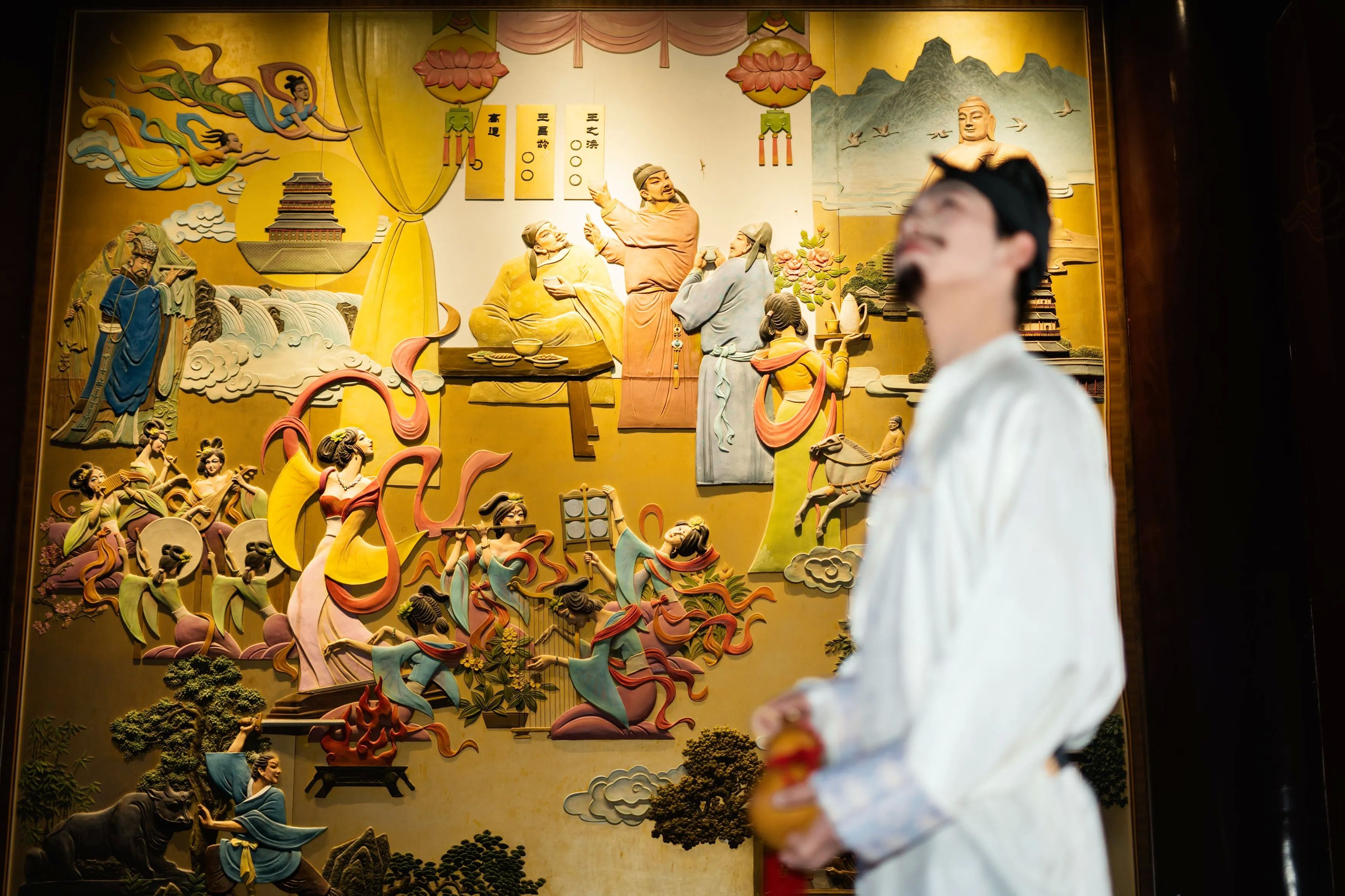NPC互动区,充满趣味,被这场活动串联成了一条通往大唐的时光隧道。在园区里漫步,唐代风格的建筑错落有致,而飘扬的酒旗、精美的灯笼,是这片古韵最忠实的见证者。
