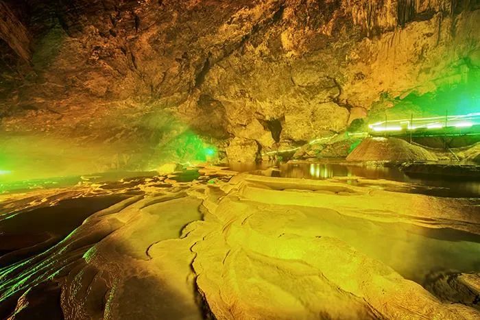 「边石池大厅」被誉为「世界溶洞四绝」之一,2万平方米的洞厅内铺满层叠如梯田的钙化池,在灯光下呈现翡翠色波纹,宛如外星地貌。此处已列入吉尼斯世界纪录,摄影出片率极高。
