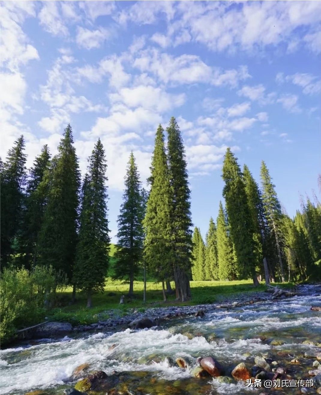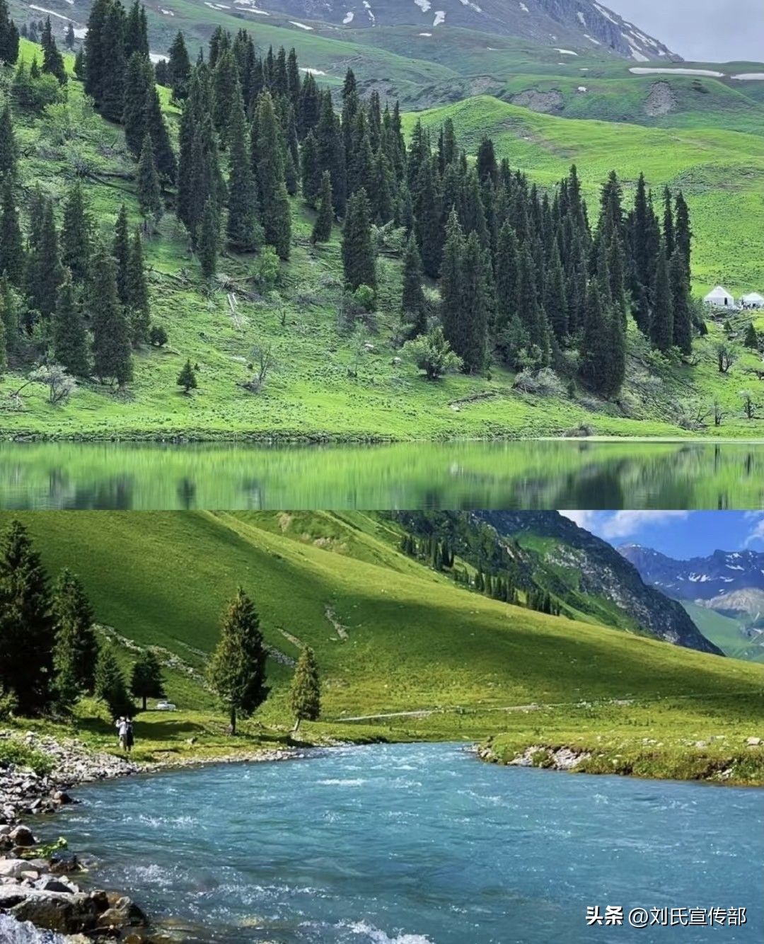 自然景观:喀什河蜿蜒其中,雪山云杉相映成趣,草原、森林、溪流与花海相互交融,构成了如诗如画的美景。#游走百里画廊# 沿线有仙女湖,碧绿湖水倒映着皑皑雪山,6-7月湖畔野花烂漫;还有小华山,需爬2700级左右台阶,爬升海拔300米,到顶后视野开阔,能看到高山草甸、树林、雪山等。