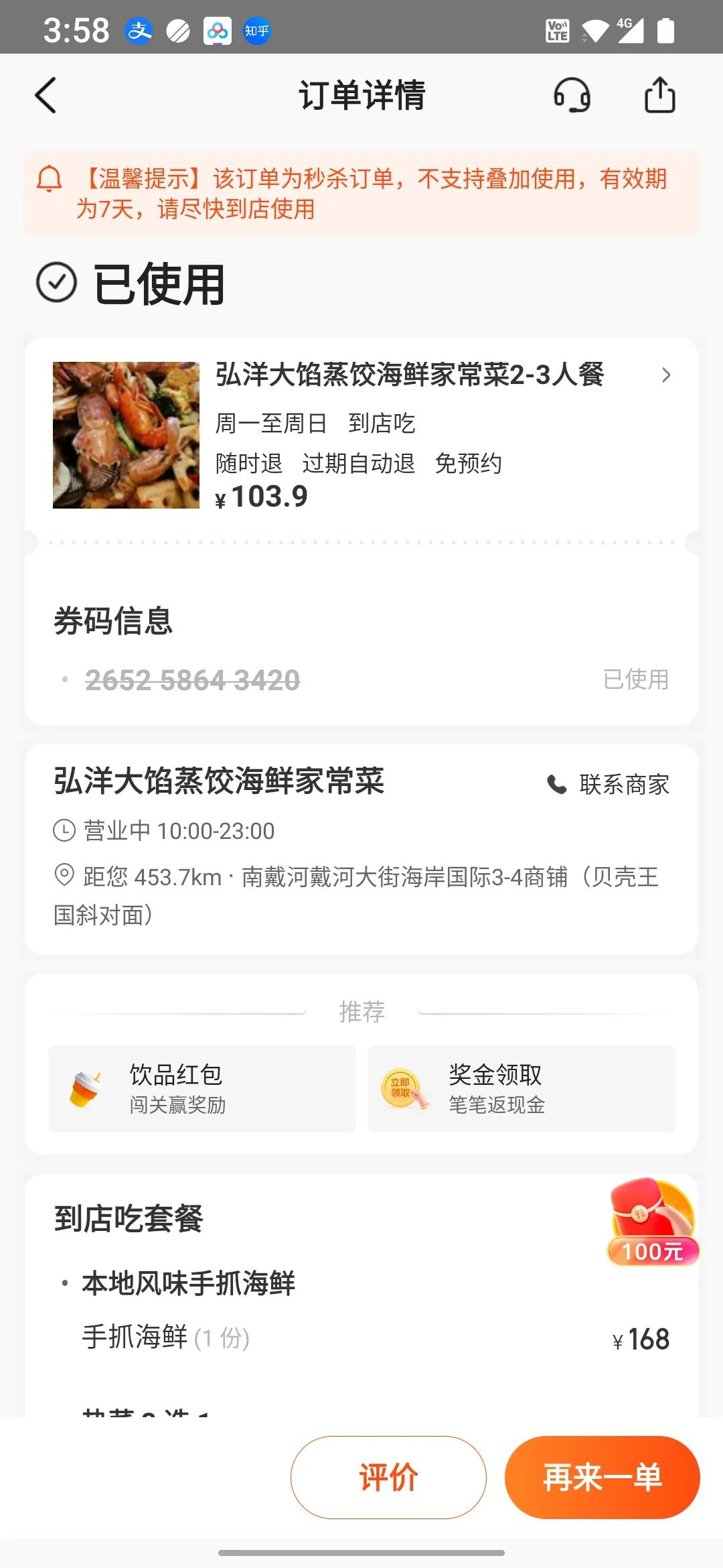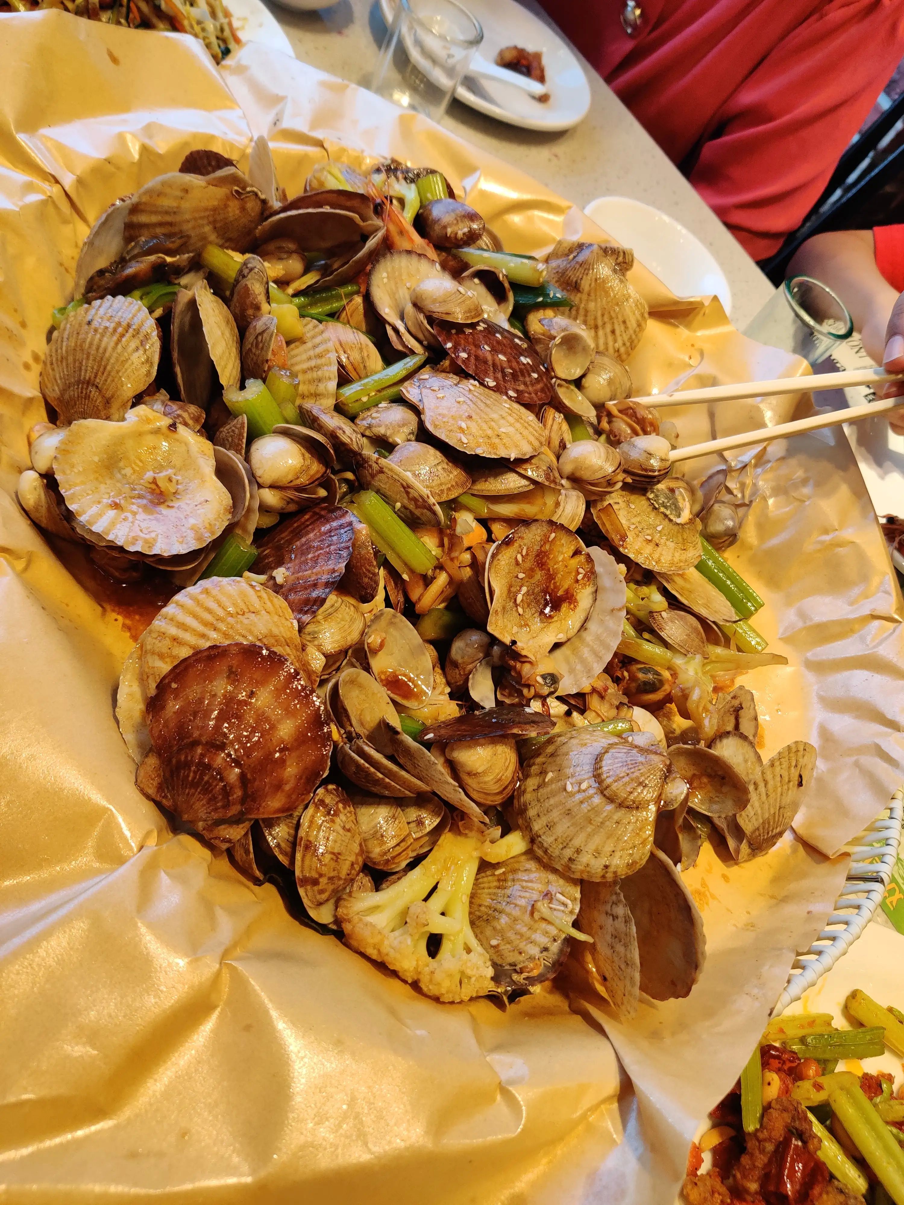 午饭:团购103海鲜, 饭店老板赠了两个海螺吹笛