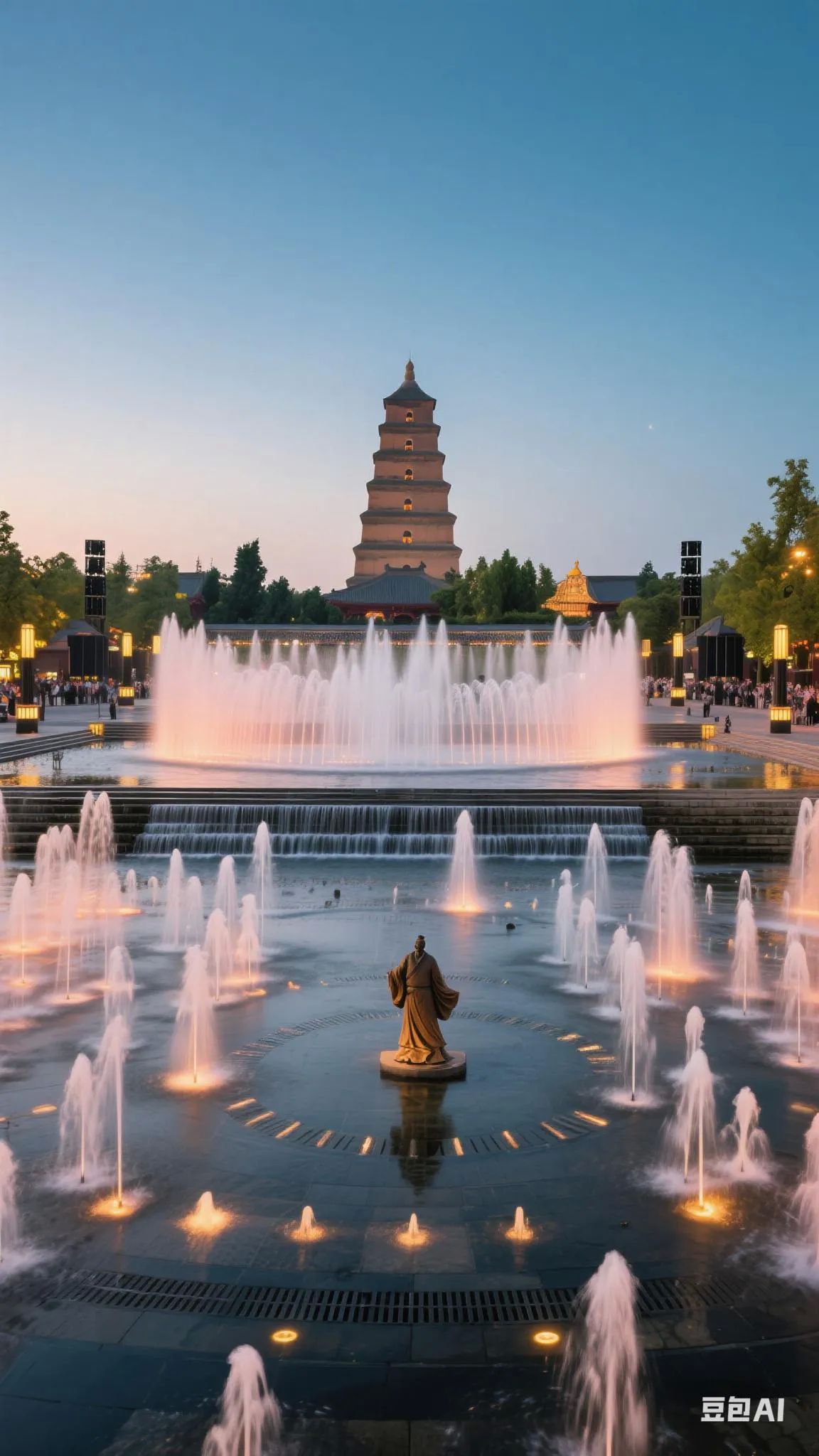 大雁塔北广场:亚洲最大的音乐喷泉广场,每晚20:30(夏季21:00)上演声光电盛宴。喷泉设计22种独立水型,配合高保真音响,演绎《水韵雁塔舞动西安》等曲目。广场内还有百米瀑布水池、八级跌水池,以及《李白行吟图》等文化雕塑。